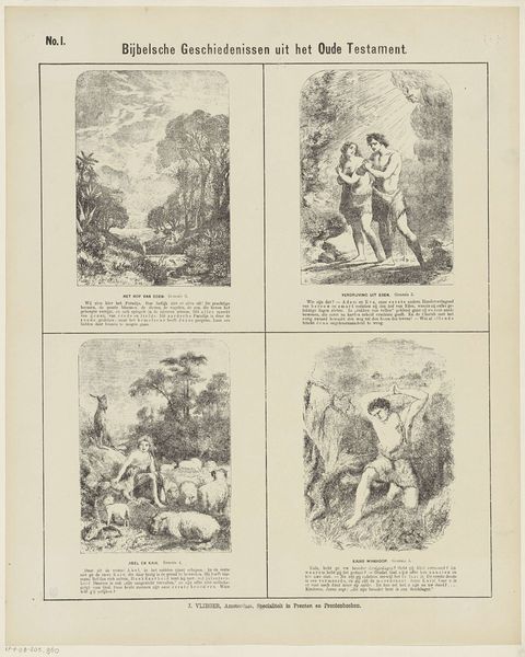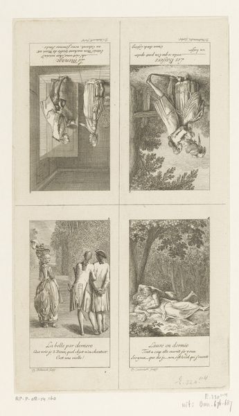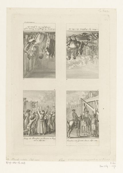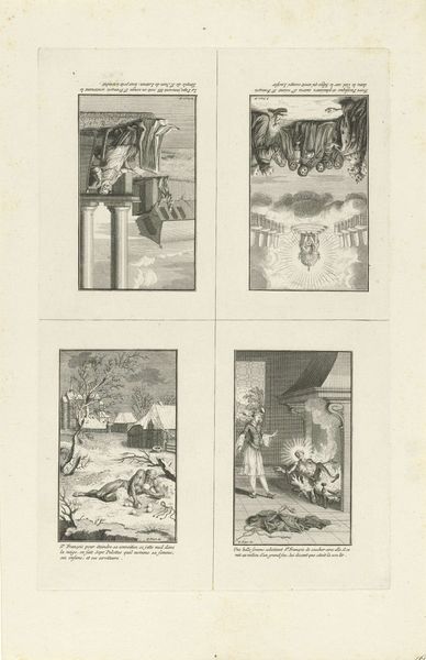 Editor: So, this is "Scenes from the Life of Saint Francis of Assisi," an engraving by Bernard Picart from 1734. The scenes feel very formal and theatrical to me. What jumps out at you? Curator: The organization into four distinct scenes immediately suggests a narrative about power, religion, and their intertwined relationship. Given Picart's era and the subject matter, I think we have to consider the social and political functions of religious imagery at that time. How does this depiction reinforce or challenge existing hierarchies? Editor: That's interesting. I was focused on the visual storytelling, but I see your point. Is it fair to read each scene individually, or do you see them functioning together to convey a broader message? Curator: Both! The individual scenes show idealized moments from St. Francis's life, and yet when viewed as a whole, it creates a broader assertion of moral and ecclesiastical authority. The use of line engraving flattens the image and directs our eyes through each staged panel according to the narrative. What impact might that have on the viewer? Editor: It’s interesting you mention flattening. Does the “flattening” that you describe speak to power or submission? Curator: Perhaps both simultaneously. Religious iconography often presented an idealized version of life to influence the moral direction of people. Here we see idealized power and its use. Consider what those choices meant for people experiencing socio-political disparity. Editor: So, the artist seems to suggest how St. Francis may have approached certain conflicts. Curator: Exactly. Looking closely, do the choices Picart made potentially celebrate and/or subvert those existing power dynamics? Editor: I hadn't really thought of it that way. I was too caught up in the aesthetic. Curator: Which is important, too! But art always exists within, and responds to, a context. Hopefully, you'll view artwork a little differently now. Editor: Definitely, and I'm very grateful for this new understanding. Thanks!