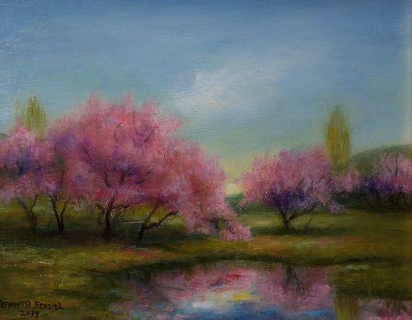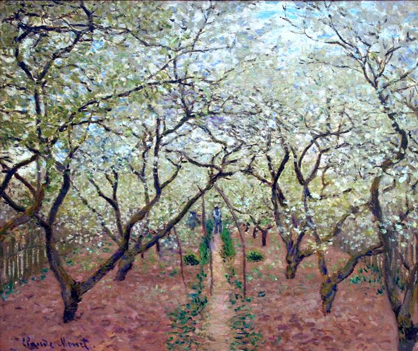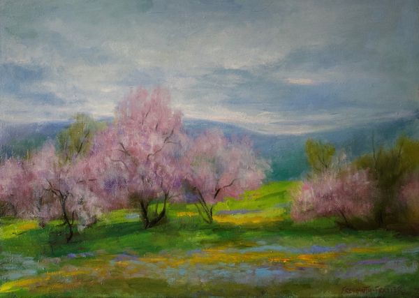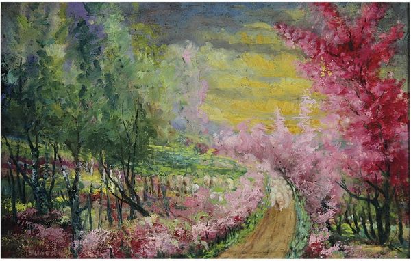 Editor: Here we have "Blooming Apple Trees" by Kimon Loghi, rendered with oil paint in a plein-air, impressionistic style. It feels like a scene bursting with life, yet there's also something fleeting and fragile about it. How do you interpret this work? Curator: The "fleeting" and "fragile" that you identify immediately make me think of cycles of regeneration, something that's certainly resonated differently depending on various sociopolitical and cultural contexts, right? Considering Loghi likely painted this en plein air, how might the act of painting directly within nature speak to larger, intersectional dialogues surrounding the environment, land ownership, and human interaction with the natural world in Loghi’s time? Editor: That's fascinating! I hadn't considered the layers of meaning behind simply painting outdoors. Was this a common practice, and how might it relate to societal views on nature then? Curator: Painting en plein air gained popularity with the Impressionists, offering a break from academic traditions and an engagement with the realities of the external world, outside of the restrictions of a studio. Considering, then, that we still define art schools with respect to this tradition – to *go outside* and 'engage with the real'– does it not say more about the politics of keeping 'the real' outside of our 'internal' understanding of knowledge production? How might we re-interpret nature as something other than that which we *visit* and *borrow* inspiration from? Editor: Wow, that is such a shift in perspective. I usually think of Impressionism as just pretty landscapes, but it's clearly much more involved and important than I realized. Thank you for helping me see the bigger picture here. Curator: Absolutely. It is by unpacking the many meanings held within "just pretty landscapes" that we can continue to critically discuss art's position in relation to current socio-political ecologies.