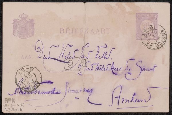 Curator: Here we have “Briefkaart aan Philip Zilcken,” a postcard dating from between 1911 and 1916. It's rendered in ink on paper. Editor: A postcard. There’s something immediately poignant about these fragile, fleeting forms of communication. Like capturing a whisper across time. Curator: Precisely. Postcards in this period became immensely popular, linking individuals through affordable and accessible correspondence. This one’s addressed to Philip Zilcken. Editor: Zilcken… Was he another artist? Curator: Indeed, Zilcken was a Dutch painter, engraver, and writer. The text appears to be written in French. It includes what seems to be a personal note, discussing a previous visit and sending greetings. Editor: Ah, a social exchange between artists then! I’m particularly drawn to the handwriting, it’s both elegant and rushed. A sense of immediacy. Almost stream-of-consciousness with those loops and flourishes. Curator: That hand-lettering style was definitely having a moment! Also consider the practical considerations—the brevity demanded by the limited space shaped what was deemed worthy of conveying. Editor: You know, looking at it, the handwriting itself feels like a drawing. The shapes of the letters become almost abstract when you consider how efficiently it delivers sentiment and information. It transcends pure function. Curator: Absolutely, the material culture surrounding postcards reveals social dynamics. Think about the rise of literacy, affordable postal services, and evolving ideas about leisure and travel—all are right here, encoded within this artifact. Editor: It also triggers the romantic in me, of imagining lives intersecting across the years, fleeting thoughts preserved… I wonder about the exact context, the untold stories hinted at but forever out of reach. It's beautiful, melancholy, but also filled with hope. Curator: A pertinent observation. Ultimately, these snippets grant insight into the texture of daily life a century past, an impression enhanced, ironically, through their imperfections and the brevity. Editor: Agreed. Seeing this, I almost feel impelled to send a handwritten postcard to someone today. A reminder of simple human connections.