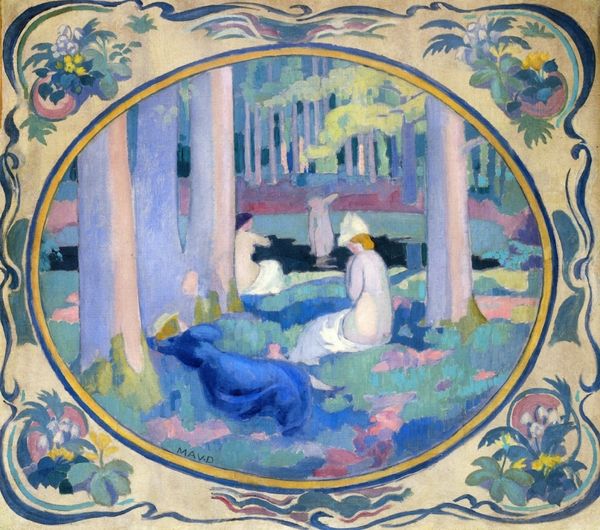 Curator: Maurice Denis created this work, "Martha and Mary," in 1896. The tempera and oil paint on canvas piece currently resides at the Hermitage Museum in Saint Petersburg. Editor: My first thought? Quietude. A kind of serene domesticity mixed with, maybe, a hint of melancholy. The colors are so muted, dreamlike. Like looking at a faded memory. Curator: Observe the composition. The figures are rendered with a deliberate flatness, characteristic of the Nabis group. This is most evident in the simplification of their faces, barely defined. Also, take note of the horizon line, set high, which compresses the pictorial space. Editor: Right, and the poses—very stylized. Almost like figures in a medieval tapestry. But what strikes me is the contrast. We’ve got the implied bustle of Martha, bringing food, versus the contemplative Mary with her goblet. It’s about action versus introspection, isn't it? Curator: Precisely. The biblical reference serves as a symbolic framework. Martha, engaged in earthly concerns, contrasted with Mary, who has chosen the spiritual path. It’s a commentary on different modes of being, reflecting Denis's Symbolist leanings. Editor: But isn’t there something gently subversive about it too? I mean, we’re invited to contemplate both roles. The painting doesn't seem to condemn Martha’s "earthly concerns." It's saying they both have their place. What is especially fascinating to me is the outside is as much a psychological interior, I’m also quite obsessed by the blue hues. It looks both heavy and floating! Curator: Indeed. The hazy landscape beyond further reinforces the theme. Notice how it functions almost like a backdrop in a stage play. It highlights the narrative but remains slightly ambiguous, never overpowering the central figures. This deliberate ambiguity invites our interpretation, allowing for a range of readings. Editor: It’s one of those paintings that reveals something new each time you look at it. A little world brimming with layers of quiet symbolism and those strange flattened figures are always drawing me in. The landscape hums... Curator: Yes, the work possesses a certain timeless quality. Its structural integrity and symbolic richness allows it to resonate even today. Editor: For me, it’s the quiet tension that holds me. The unsaid dialogues…the beautiful tension of being that hums underneath the mundane. A poem of domesticity really!