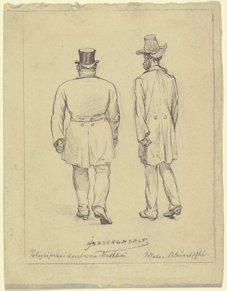 Curator: Today, we are looking at "Standing Farmer with Scythe and Farmer in Dress Uniform," a pencil drawing created around 1830 by Martinus Rørbye. What are your initial impressions? Editor: I’m immediately struck by the stark contrast between the two figures. The rough sketch-like quality gives it a rather somber and straightforward feel, almost anthropological in its focus on details. Curator: That’s insightful. This work reflects Rørbye's interest in depicting everyday life and traditional costumes during his travels. Notice how the attire signifies the men’s distinct roles. Editor: Indeed. The man with the scythe looks almost stoic, the heavy tool slung across his back creating this visual line of labor. Then there’s the other man, upright and quite refined in his decorative outfit; that light pencil rendering seems perfect to give it a refined touch. The tassels on his socks is a clever detail! Curator: The meticulous detail Rørbye employed in rendering the dress uniform offers a glimpse into the rising national romanticism of the era. Artists celebrated regional and rural identities. These drawings contributed to an idealized version of folk culture, even as it stood in contrast to increasing urbanization. Editor: It is remarkable how Rørbye balances precision and efficiency with just a few lines. Note how the faces are handled with sparse strokes, yet each has a discernible character. The clothing of both figures are handled in equal detail to each other, to show them as men of similar value regardless of their respective trades, this speaks volumes to this artwork. Curator: Precisely. It showcases how artistic documentation played a vital role in constructing cultural identity and historical memory. It suggests deeper considerations of class, labor, and representation in 19th-century Denmark. Editor: The artist's mastery is evident in conveying character and contrasting societal roles with this simple medium. Curator: Rørbye uses this genre-painting portrait to communicate how ordinary men can communicate importance within society. Editor: I find this art incredibly thoughtful because it is not merely about documentation.