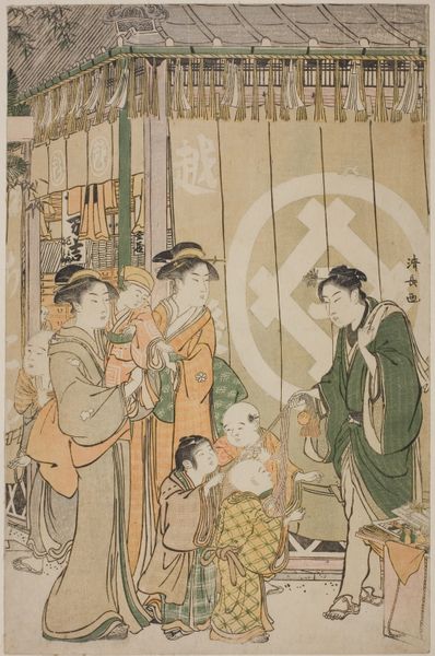 Curator: This print, "First Meeting (Miai), from the series "Twelve Stages of Matrimony," created around 1775 by Torii Kiyonaga, offers us a glimpse into Japanese social customs of the late 18th century. The Art Institute of Chicago holds this particular woodblock print. Editor: It’s funny; seeing it now, it’s got this hushed anticipation, but a subtle playfulness too! The soft colors—pale yellows, grays, and browns—create a mood of restrained excitement, and then you spot the chicken... strutting in like it owns the place. Curator: Precisely! The composition draws us in with these figures arranged across the picture plane; observe their stylized gestures, the cascading folds of their garments rendered with meticulous lines. Editor: I love how the artist uses line. Each figure almost seems defined by flowing strokes, less like portraits, and more like... melodic shapes fitting together, right? The chicken is great, though! Is there something to say that a fowl can stand against such beautiful creatures. Curator: Yes. As an example of Ukiyo-e, this work reflects the aesthetics of its time. These genre scenes offered idealized representations of daily life and theatricality, popular amongst the merchant classes. But look closer, there's tension in those slightly bowed heads! They're about to take a life changing decision Editor: Mmm...it makes you think, doesn't it? To them, their lives were as dramatic as ours are today... only quieter... the colors, so soothing, speak of serenity, even if arranged marriage to us is more terrifying! But a little chicken pecking about! He reminds me of an absurdist stage show! It's like Beckett suddenly wandered into an 18th century parlor. Curator: What this work does so expertly is communicate both formality and spontaneity. The subtle gradations within the woodblock printing also contribute significantly to the work’s sense of depth, wouldn't you say? The composition seems stage-like. Editor: Yeah! From one single piece you can understand something beyond representation. The artwork lets our brain and imagination mingle and go elsewhere. We see how social standards were more solid in the past but their emotional lives weren't. Now the chickens are free to mingle with who they wish, and maybe nothing's changed at all... it's something really interesting!