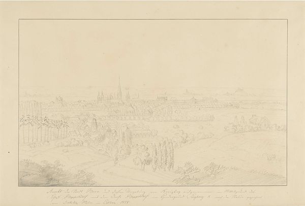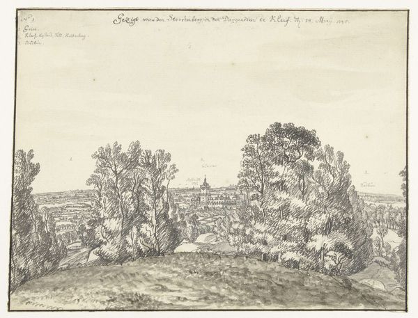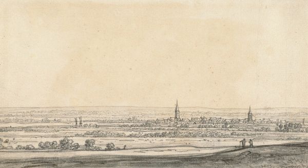 Curator: Looking at this delicate rendering of a distant cityscape, one almost forgets how politically charged landscape imagery was during the Dutch Golden Age. Aelbert Cuyp, likely sometime between 1630 and 1691, captured this panoramic view of Kleef using pencil. Editor: The hazy atmosphere gives it such a removed feeling, almost as if you're observing a miniature world. The pencil work is incredible, so fine and yet descriptive. I'm immediately drawn to the details he manages to render, especially with that tonal range. Curator: Indeed, drawings like these provided more than just visual pleasure; they were crucial in establishing Dutch identity and solidifying claims over territory, projecting an image of cultivated land and civic pride to an increasingly engaged public audience for imagery. The very act of representing the land was an act of asserting control. Editor: You see, I am curious as to where Cuyp sourced his materials. What type of pencils were they, who made them? Because of the specificity of line, they must be crafted and of good quality, revealing complex economies behind this seemingly straightforward depiction. And what did it mean for an artist to be investing time and skill in something as quotidian as pencil drawing during a period marked by new painting innovations? Curator: Fascinating points! It’s easy to overlook the networks of craftsmanship, especially when thinking about the final image circulating in a gallery context as part of artistic "high society". The imagery reflects back to this upper echelons, a reminder of property, social stratification, even. Editor: And those lines aren't just lines, they signify labor, access to resources. Even this perceived effortless atmospheric effect—was this achieved with particular pigments incorporated into the drawing tools? Curator: Considering how art became increasingly intertwined with the growing merchant class, drawings such as this provide us insight into social status and the relationship with landscape as something both aesthetic and economic. Editor: It truly demonstrates how every material detail of the piece, including its production and the labor that sustains the scene it depicts, tells us much more about the place of image production in a society. Curator: A poignant reminder that viewing landscape, and really any image from this historical context, means reading a detailed network of cultural and material meaning. Editor: Yes, and a reminder that even the seemingly simple is entangled with layers of practice, labor, and means of material engagement.