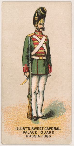 Curator: This is “Fatigue Dress, Lieutenant General, Spain, 1886” a print that was originally issued by Kinney Tobacco Company. What's your take on it? Editor: I find the whole image intriguing! The colors are strangely muted, yet there's a stiff formality about the General that’s unsettling. It projects power, yet simultaneously feels… drained. Curator: Absolutely. The stiffness really highlights how constructed these images are. The goal was to romanticize military life in 19th century Spain to sell cigarettes to folks back home! Editor: I’m interested in that contradiction: "fatigue dress" implying comfort, while everything about this image screams regimentation and restriction. How can we see it as connected to Spanish history in this light? Curator: I'd argue it plays into a very specific type of patriotism: tough, proud, unwavering…even when exhausted. Of course, we have to remember the late 1880s were tough years for Spain and its colonial ambitions, with rebellions brewing. The image is more aspiration than reality. Editor: Precisely! So, the ‘fatigue dress’ is perhaps a projection of the desired colonial strength and posture even during a time of weariness or, indeed, crisis. I keep thinking about that red sash cinching him so tightly at the waist—a kind of beautiful oppression? Curator: Now, that's an idea worth exploring. This 'beauty', as you call it, is just masking a ton of military anxiety with shiny buttons. So this postcard aims to gloss over a reality by looking towards some colonial fantasy! It's more propaganda than a portrait, really. Editor: Yes, because underneath, beyond the ‘illustration’, it points to some broader sense of cultural exhaustion and fading global power, a nation struggling to maintain its image on a very small piece of cardboard. Curator: Thanks for shedding light on how this rather curious piece participates in that legacy, one puff at a time. Editor: A pleasure, it makes me think of how these images functioned, both as marketing material and cultural mirror.