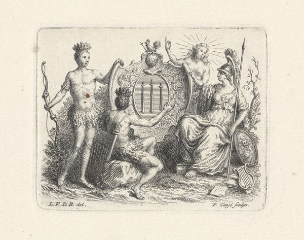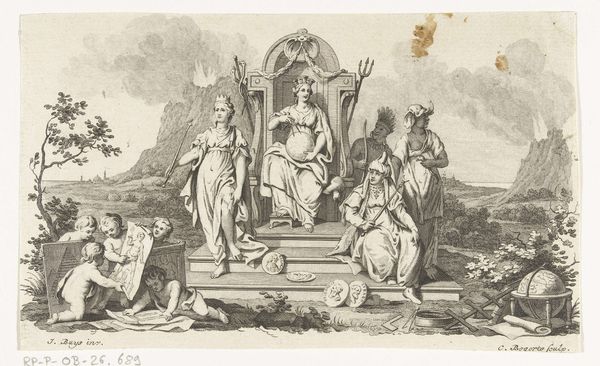 Reinier Vinkeles created this print called "Allegorical figures at a medallion for the national theater" in the late 18th century using etching. The print shows three female figures sitting around a medallion. In the 18th century, the theater served as a crucial public space for shaping cultural and national identity through performances. The women in this print embody the values associated with theater and nationhood during this period. Crowned, one figure holds a laurel wreath symbolizing victory and excellence, while the others hold items referencing music and drama. The attire of each woman can be seen as representative of different social classes. The figure to the left, cloaked in simple drapery, is holding a spear, while the figure to the right is holding a trumpet. The print can be seen as a reflection of the Enlightenment-era ideals of reason, order, and civic virtue that shaped the national theater movement. It invites us to consider how artistic and cultural institutions have historically been used to construct and reinforce national identities.
