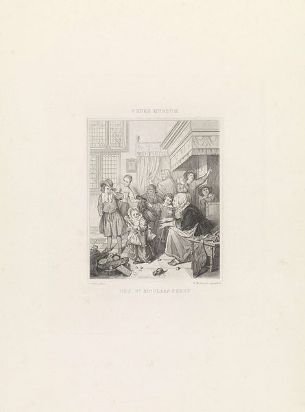 Editor: This print, made with etching, is titled 'Willem Beukels laat zijn eerste gepekelde haring proeven' from 1842. I think the print looks busy and its full of figures! How can one start to examine this piece? Curator: Indeed, this print, categorized as a genre scene, exhibits a carefully arranged composition. Focus first on the distribution of light and shadow. Observe how the artist employs etching to create tonal variations, guiding your eye across the narrative. Where do you see the greatest contrast and what effect does it produce? Editor: Well, I notice that there's contrast in the center, on the figures offering and sampling the pickled herring. So does the composition here guide us to focus on a certain interaction between the characters depicted? Curator: Precisely. Notice the distribution of figures in relation to the implied vanishing point, how the artist uses their placement to establish depth. And observe the textures rendered by the etching technique. How does the line quality differ between the foreground and background, and how might that inform our reading of space? Editor: Now I see, by rendering those tonal and textural contrasts, it's easy to grasp what the artist wanted to foreground. What I initially thought was busyness, turns out to be a sophisticated ordering of pictorial space. Curator: Correct, furthermore, such strategic placements draw our focus to essential subject matters. Ultimately, that initial impression of a "busy" print reveals the structured intent behind the artist's decisions in light, line, and form. Editor: I've learned a lot by just breaking down how this etching directs my eyes using a contrast of form!