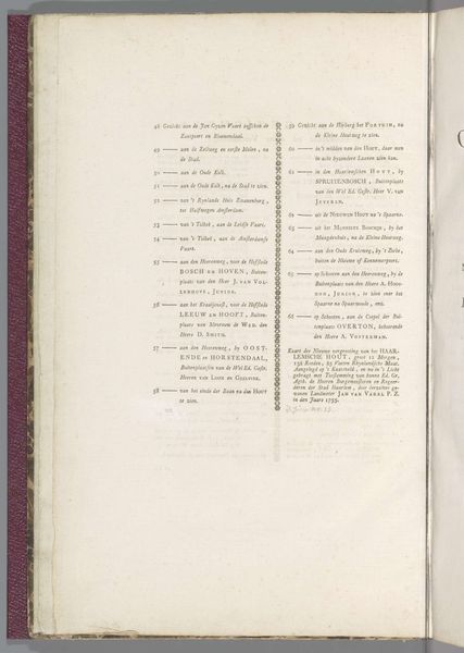 Curator: Here, we have a content sheet titled "Goldsmiths' and Metalsmiths' Designs" by Denis Diderot. Editor: It appears to be a rather dry document. I find the layout quite rigid, even oppressive, in its systematic arrangement of text. Curator: The content sheet serves as an index to a series of design plates. Note how Diderot meticulously itemizes each design, almost cataloging them. This structural clarity is paramount. Editor: Indeed, it reminds me of an inventory, but one that seems to drain the life out of these presumably beautiful objects. Where is the cultural context, the story behind these designs? Curator: Context lies within the structural relationships. The typography, the divisions into "Planches"—it all speaks to a particular mode of organizing knowledge in that period. Editor: I suppose, but I long to know what meanings these designs carried for their creators and consumers. Curator: Perhaps we are meant to infer that from the designs themselves. Editor: A structural beauty that is revealed only through understanding its cultural purpose. Curator: Precisely.