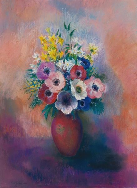 Editor: This is "Bouquet of Flowers in a Blue Vase" by Odilon Redon, done in gouache. The colors feel almost dreamlike and I’m struck by how soft the whole composition is, even though the vase is such a deep, vibrant blue. What elements do you focus on when you look at this painting? Curator: The formal properties of this gouache are compelling. Observe how Redon utilizes the medium’s inherent chalkiness to diffuse light across the pictorial plane. The blue vase, anchoring the composition, serves as a counterpoint to the ephemeral quality of the blooms. Consider the semiotics of color employed here; does the azure of the vase possess the same symbolic weight as the chromatic variations found in the floral arrangement? Editor: That’s a good point; I hadn't really considered the contrast that deeply. Do you think that contrast creates a kind of tension? Curator: Precisely. There's a tension between the defined shape of the vase and the looser, more atmospheric rendering of the flowers themselves. How does the interaction of these two modes of representation affect your perception of the image as a whole? The surface handling, where colour and tone are built up by relatively coarse strokes of paint is interesting in itself. What do you think Redon wanted the relationship between those elements to be? Editor: I think he wanted the flowers to be the focus, using the strong color of the vase to draw us in, then allowing us to get lost in the lightness of the bouquet. I was focusing more on the imagery than the physical brushstrokes before. Curator: Indeed. By focusing on Redon’s material decisions and structural arrangement, one gains insight into the work’s underlying mechanics. Thank you for this observation of those forms; it helps make this symbolic dream world become more understandable. Editor: And thank you for bringing the technical elements into focus for me!