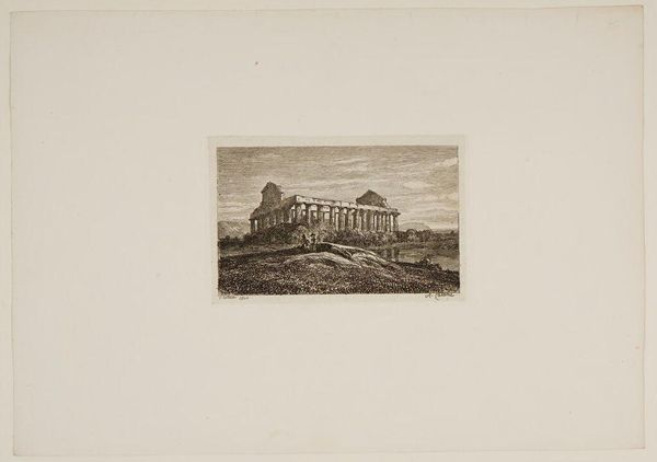 Curator: This is "Works of A. Calame, Number 33," by Alexandre Calame. Look at that dramatic sky! It dominates the composition, casting a somber mood over everything. Editor: It looks like a ruined temple in a marsh. The etching process renders these low-lying areas with heavy shadow; what do you make of the building's placement? Curator: The horizontal emphasis evokes feelings of stillness, maybe even decay. I find the interplay between the darkness of the architecture and the detailed sky intriguing. Editor: Calame's skillful use of the etching process is clear. I wonder about the economic conditions that would have led to its ruin. Curator: Perhaps it represents more than just a physical structure. The ruin might symbolize a decline in civilization, a common theme in Romantic art. Editor: Perhaps. For me, it speaks volumes about labor, materials, and even the consumption of art. Curator: I can appreciate that view, though I am struck by the careful composition above all else. Editor: It's the material reality of that ruin that draws my eye, and its role in the narrative of production.