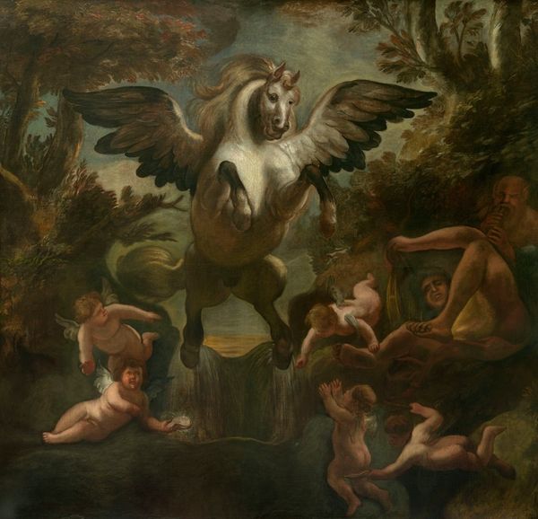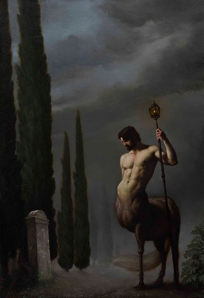 Editor: Here we have Konstantin Korobov's oil painting, "Centaurus," though its exact date is unknown. The painting portrays a centaur fending off a wolf in a rather classical style. I am struck by the implied narrative; the piece evokes this sense of wildness meeting civilization. What stands out to you about it? Curator: I’m particularly interested in the socio-political undercurrents one might read into it. Consider the long history of representing centaurs. Often they embodied base instincts, a threat to the Apollonian ideals of Western society. But here, defending against a wolf? Is Korobov suggesting a more complex role for these mythological beings? Are they now protectors, maybe even symbols of a more integrated relationship with nature, pushing back against what it means to be "civilized"? Editor: That’s a fascinating point! The animal skin draped over the Centaur is adding to that discourse, contrasting "nature" with "culture". Does the realism style play into that too? Curator: Precisely. The style of realism in itself is already a cultural act, trying to represent 'truth'. But whose truth? For whom is the wild dangerous? Think about how such imagery served nationalistic agendas by naturalizing cultural ideologies in the late 19th and early 20th centuries. In light of our contemporary lens, can we view the piece outside of those political frameworks? Perhaps Korobov is encouraging us to challenge these dichotomies? Editor: I hadn't considered the potential nationalist readings of this type of genre-scene, it provides additional layers of understanding to what seemed like just a classical painting at first glance. Curator: Exactly! It's in looking at the cultural uses of images where much of the insight and power emerges. Hopefully it allows new readings.