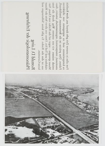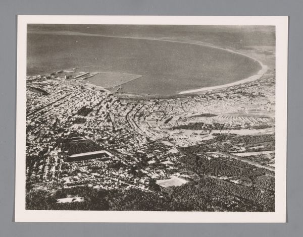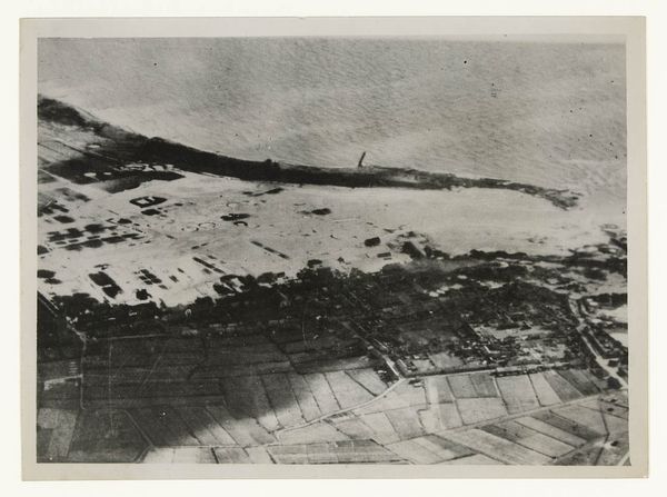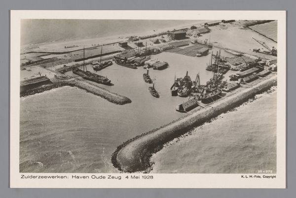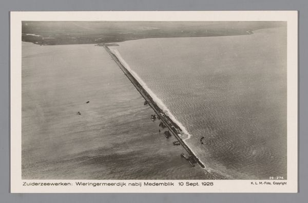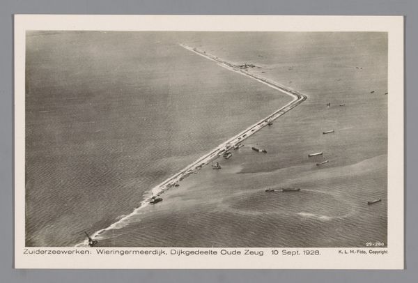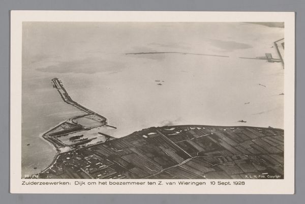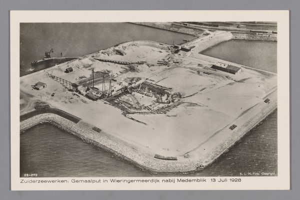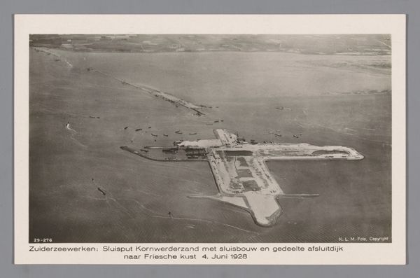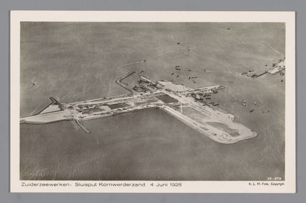 Curator: The composition of this photographic print, "Zuiderzeewerken: Sluisput Kornwerderzand met sluisbouw en gedeelte afsluitdijk naar de Friesche kust 10 mei 1928," immediately strikes me with its stark contrast between the man-made structure and the seemingly endless sea. The aerial perspective lends it a detached, almost architectural quality. Editor: It's a bleak landscape. The monochrome palette accentuates the industrial feel of the construction. I’m struck by how the image highlights humanity’s imposing intervention upon the natural environment. Curator: Absolutely. It's key to remember the context here. This photo documents a vital stage of the Zuiderzee Works, a massive land reclamation project in the Netherlands. Think of the sheer amount of labor that went into the project at this phase. Editor: I see the photograph more as a study of form. Note the dynamic interplay between the geometric precision of the sluice complex and the fluidity of the water. It seems to me that there is an opposition between control and chaos in its lines and curves. Curator: I agree on the visual impact, yet consider that beyond the geometry, we also witness the material consequences of a changing relationship between the Dutch and their landscape: stone, earth, concrete, and human energy converging. This monumental hydraulic endeavor transformed not just land but also the social fabric dependent upon the ebb and flow. Editor: I concede that it embodies the human ambition of the modernist project. Through semiotics, we perceive that each element acts as a sign, which constructs a layered narrative between control and a desire for harmony. Curator: A productive harmony that redefined material resources for the Dutch, in the process disrupting conventional material consumption, while producing novel ones and enabling unique socio-political realignments. Editor: Well, regardless, what impresses me is how its contrasting forms invite contemplation on industrial transformation through landscape representation. Curator: Yes, and viewing it with attention to its complex socio-material reality illuminates how monumental artworks reflect more than merely artistic visions, but very real societal undertakings.