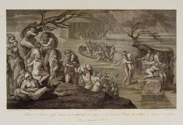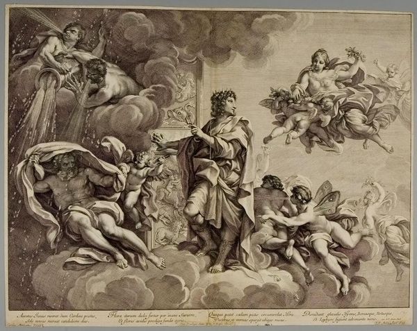 Editor: This is "Galeriae Farnesianae: Andromeda" by Pietro Aquila, created sometime between 1650 and 1700. It looks like an engraving, and the scene is so dramatic! What do you see in this piece, considering its historical context? Curator: Well, consider how the myth of Andromeda functions in the public sphere. It often served as an allegory for female virtue and the power of divine intervention, reinforcing societal expectations. This image is part of a larger project documenting frescoes, so how does its existence reflect institutional power structures and artistic patronage of the time? Editor: That's a good point! I hadn't thought about the role of documentation in shaping perceptions of art and power. I'm starting to see how this image reflects more than just a mythological scene. Curator: Exactly. By understanding these contexts, we gain insight into the politics of imagery and the public role art played. Editor: Thank you, I definitely have new lenses to think about art with!