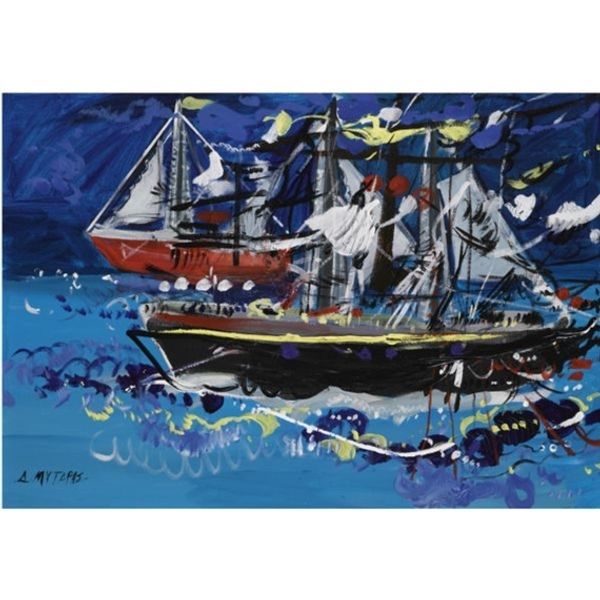 Curator: Today, we’re looking at “Ships in a Port” by Dimitris Mytaras. This painting uses acrylic paint and really showcases Mytaras’s take on expressionism, capturing a harbor scene. Editor: My first impression is a feeling of raw energy. The bold, almost chaotic brushstrokes, combined with the high contrast of colors, definitely evoke a sense of movement, and even a touch of anxiety, within this harbor scene. Curator: Absolutely, the vigorous application of paint speaks to the core of expressionism. Mytaras, known for his engagement with social issues through art, often imbued his work with powerful emotional and political undertones. Although untitled and undated, this painting potentially offers insights into how he perceived societal structures – here, through the maritime industry and perhaps the individuals connected to the port, such as the labor class. Editor: That's a very valid reading. Looking at it from another angle, the frantic lines depicting the ships' masts, contrasting with the softer rendering of what could be the harbor itself, create a kind of visual tension. I wonder if he was making a statement about the relentless pace of progress versus the grounded stillness of traditional ways of life? Is it even right to define which is one and the other here? Curator: It is an interesting juxtaposition! Moreover, the visible brushstrokes make the labor of painting very present within the composition. And that labor in itself is another layer we could add to any conversation about it, especially thinking about a post-industrialization world in which every labor gets alienated by processes outside individual will. Editor: I agree entirely, particularly in light of Mytaras's career trajectory, marked by politically charged artistic engagements. It definitely prompts me to reflect on the commodification of labor within art, but then, beyond, too, the human costs of maritime industries and globalization. Thank you. Curator: And thank you. It seems “Ships in a Port” manages to encapsulate a fascinating array of tensions present in our daily reality, all beneath this turbulent exterior, making it an intriguing work to ponder.