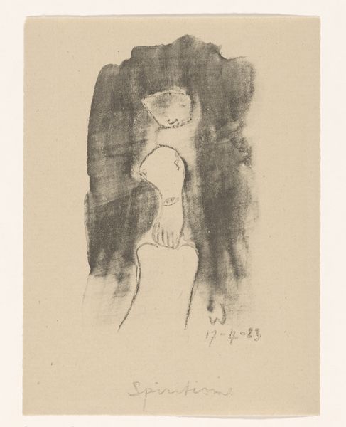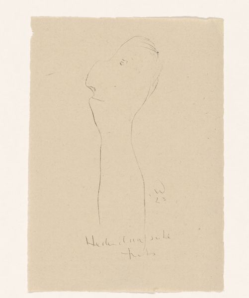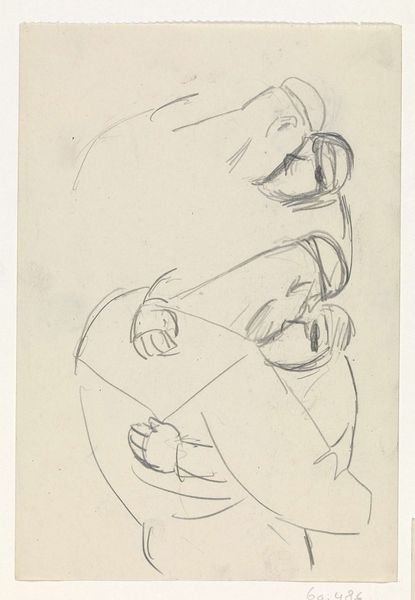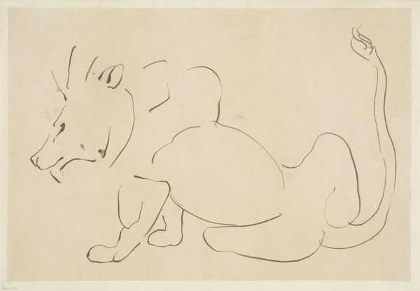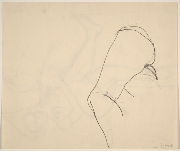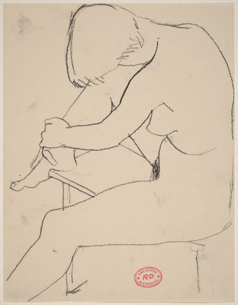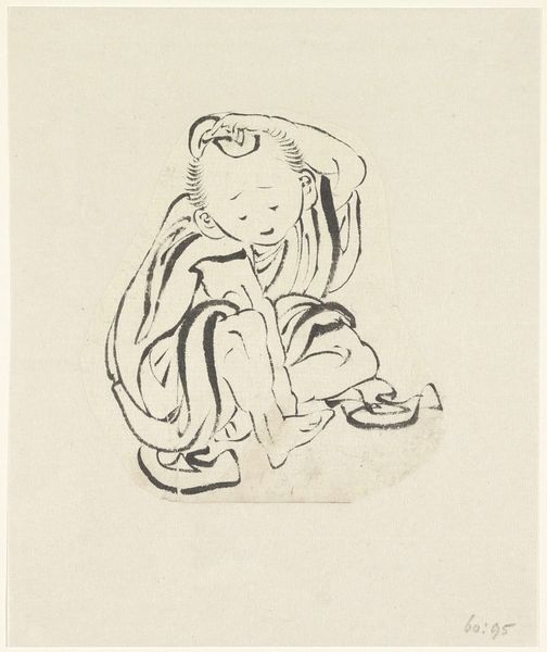 Curator: This drawing, "Washload," by Benny Andrews from 1970, uses simple ink lines to depict a figure hunched over a washtub. What springs to mind when you see this piece? Editor: Immediately, I feel the weight. It's minimal, but the posture, the bare feet planted... there's a quiet weariness captured in those few lines. The lack of detail almost amplifies the feeling of endless labor. Curator: Andrews had a knack for that—conveying profound emotional depth with incredible economy. He often explored themes of everyday life and social realism. This particular work really resonates with the imagery of struggle and resilience, doesn't it? Editor: Absolutely. The washbasin—we could see it as a font of endless cleaning and care. Water is a symbol, but so is the labor itself. Are they washing away their identity, or cleansing away stains? What meaning would washing have, for the artist, for us, for the sitter? It carries so much potential narrative in what it elides, wouldn't you say? Curator: That is an amazing reading of the image—the way its symbolism works—resonates. Given that the date is 1970, during an era of the fight for Civil Rights, one might even infer deeper themes of cultural identity and persistence within Black communities... Andrews' use of line, paring it back as much as possible really focuses on form... Editor: The figure becomes archetypal; a universal image of the laboring figure. In one swift contour drawing, Andrews creates a figure that's timeless but rooted to its very moment... and the use of simple lines helps bring the artwork close to us, as if scribbled in a notepad somewhere close by, to be uncovered years later... Curator: You are completely right about the immediacy of its appearance, which almost amplifies the sense of something seen in private and quickly documented. To linger here a bit and unpack its secrets— Editor: We could lose our own in these archetypes; perhaps the task is to find what part of yourself or our collective past can be washed up anew within each piece of work... Thank you for drawing our attention.