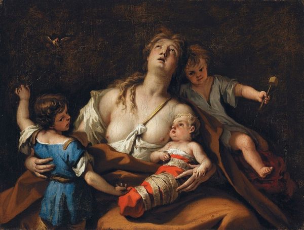 Editor: We’re looking at "Samson and Delilah" by Gerard van Honthorst, made around 1616 with oil paints. What immediately strikes me is the almost cinematic drama, everything is lit with this very harsh, almost theatrical spotlight. What do you make of this depiction of the biblical scene? Curator: Ah, Honthorst! Nicknamed "Gherardo delle Notti" in Italy—Gerard of the Nights—for his masterful use of *chiaroscuro*, that play of light and dark. It’s interesting, isn’t it, how he's not necessarily aiming for historical accuracy, but for maximum emotional impact. The candle, the single source, illuminates this treachery unfolding. Doesn't it feel like we're intruding on something intimate, almost voyeuristic? Editor: Definitely voyeuristic. Delilah almost seems to be concentrating on her work as she cuts his hair. There’s an intimacy that feels really uneasy given what’s happening. Curator: Precisely. Honthorst masterfully juxtaposes beauty with betrayal, sleep with vigilance. Consider that older figure, finger raised, commanding silence. It's like a stage direction, a carefully orchestrated moment of perfidy captured forever. Is there something about his theatrical staging you find compelling? Editor: Absolutely. It is interesting to view the single candle burning that represents betrayal under darkness with dramatic spotlight. Curator: Think about what candlelight would have represented at that time - limited technology. The focus, composition, is superb. I have come away considering more profoundly the story of deceit between Samson and Delilah and how it has had such a lasting impact over centuries. Editor: I agree; the intimacy combined with stark lighting really elevates this biblical narrative to something intensely human.