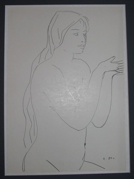 Editor: Here we have Hryhorii Havrylenko's "Nude," a pen drawing on paper from 1981. There’s something almost clinical about it, yet the linework feels surprisingly tender. What do you see in this piece? Curator: I see a direct engagement with the complexities of representing the female form, especially within the context of the late 20th century. Consider how, historically, the "nude" in art often served to reinforce male gaze and patriarchal power. Now, in 1981, how might Havrylenko be challenging or subverting those traditions? The starkness, the seemingly unfinished quality... what do those elements convey to you? Editor: I guess I hadn't thought about it like that. It definitely feels less… idealized than a lot of nudes I've seen. Curator: Exactly. Perhaps the artist uses a modernist style to dismantle the idealised female form so commonly fetishized by society. Think about how the setting--we can infer the outdoor from the colors--subtly influences our understanding of vulnerability and perhaps even agency in this drawing. The choice to use pen and paper, simple materials, further reduces the piece down to bare honesty. Does it bring to mind for you how women, in the past and the present, claim or reclaim space for self-definition and empowerment? Editor: Yes, absolutely! I see it now, it really reframes how I perceive the gaze in the image. Curator: It makes you wonder whether the subject is viewed with respect for their identity. Art like this pushes us to reflect critically on not only how we interpret representations of the body but also who has the authority to represent it and for what purpose. Editor: This conversation completely changed the way I viewed this drawing! I see much more meaning now than when I started. Curator: Exactly! Nuance is key; analyzing through a variety of contexts can reveal greater insight.