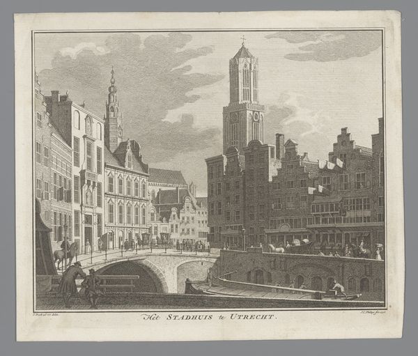 Editor: This etching, "Gezicht op de Nieuwmarkt," by Paulus Lauters, probably created sometime between 1827 and 1875, depicts a bustling cityscape. It has a somewhat muted and detailed quality, fitting the Realism movement, and offers an interesting perspective on the city's waterways and architecture. How would you interpret this depiction considering its historical and cultural context? Curator: Lauters’ etching allows us a glimpse into the rapidly changing urban landscape of 19th-century Amsterdam. Look at the detailed rendering of the buildings and the market activity. What does that level of detail convey to you about the artist's intention, or perhaps the societal values of the time? Editor: I suppose that it's highlighting a certain documentary interest in depicting the daily lives of the city's people, reflecting a broader movement towards representing the realities of modern life and the impact of modernization, rather than idealizing any one specific vision. Is there something significant in representing the Nieuwmarkt area itself? Curator: Absolutely. The Nieuwmarkt held social and political importance. As a public square and marketplace, it served as a hub for interaction and commerce. How might depicting a place like that affect the public perception and narrative around urban development and societal structure? Think about what’s *included* and what might be conspicuously *left out* in his version of reality. Editor: It really makes you wonder about what's not being shown - any sort of social unrest, the negative sides of development perhaps, which is probably a strategic choice given the context of the art world at that time. Curator: Precisely. His selective approach provides us with an image which can tell us much about that specific point in history as well as artistic licence, which highlights art's ability to reflect the complexities and ambiguities of urban experience. Editor: That’s fascinating. I'll definitely be keeping a closer eye on that moving forward!