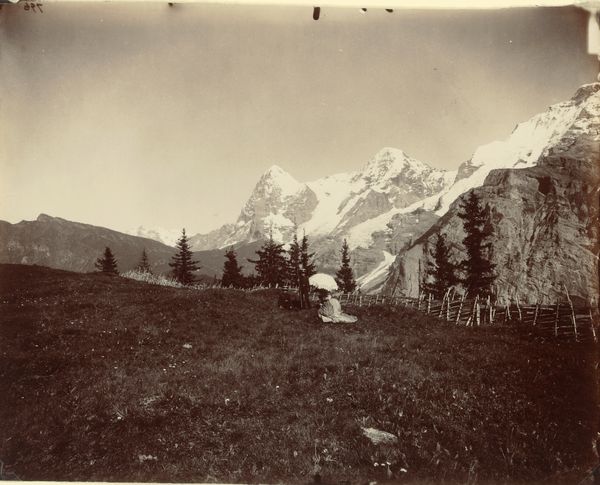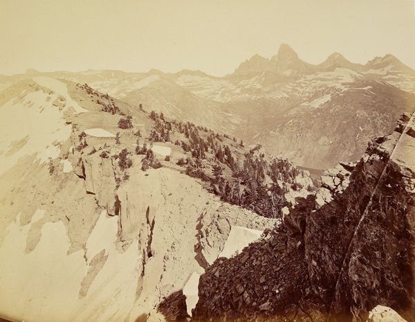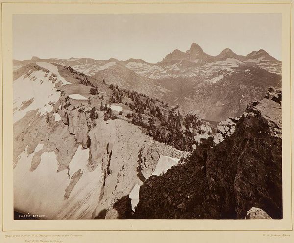Curator: This albumen print, titled "The Three Téttons," was captured by William Henry Jackson around 1873. The albumen process involves using egg whites to bind the photographic chemicals to the paper, resulting in a unique tonal range. What strikes you about it initially? Editor: The sense of vastness, absolutely. But there’s also something…sepia-toned sadness to it. It feels like a captured moment of melancholy grandeur, and I'm instantly thinking about Manifest Destiny. Curator: Indeed. Considering its historical context, we can examine the production of albumen prints and the resources required: the paper, the silver, the labor to process each image. This reflects a period of significant resource extraction in the American West. The photograph functions as a commodity. Editor: And to connect this visually with the idea of commodification and settler colonialism, the monumental landscape also plays a crucial role in shaping national identity, one founded on the erasure of Indigenous presence. What's presented as empty wilderness was inhabited land. Curator: Precisely. The very act of photographing—the labor involved in transporting equipment, setting up in the field, developing the images—represents an imposition on the landscape. Jackson, who was employed by the US Geological Survey, wasn’t just making art; he was participating in resource mapping. Editor: This ties directly into discourses of power and knowledge. The photographic documentation wasn't simply for aesthetic appreciation, but also facilitated control over land and people. I think a close study of similar images by Carleton Watkins and Timothy O’Sullivan reveals related techniques of ideological positioning within landscape imagery. Curator: I agree, and seeing these printed and bound in albums shows that the image became part of a viewing trend and part of domestic space. These were meant to be collected, viewed, and handled, changing them with constant use. The fingerprints, fading, and wear mark its utility. Editor: Yes, and beyond the pristine photographic surface, we can discern the stories and histories etched onto it—of both the materials used and the social narratives implicated in its making. Jackson wasn’s simply documenting a sublime wilderness, but also legitimizing the expansionist ideology of his time. Curator: Looking closely at the material reality alongside the image brings new context. Editor: And seeing its beauty with awareness reframes how we internalize these views.