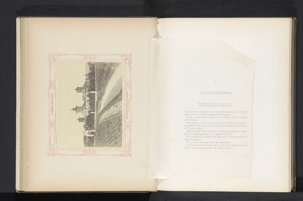 Editor: We're looking at a page from what seems to be an old book. The print shows “Gezicht op Vitznau, aan de voet van de Rigi-berg,” or “View of Vitznau, at the foot of Mount Rigi," made before 1898. The whole image feels sort of whimsical, almost like a scene from a storybook with decorative elements framing the text. What do you notice here? Curator: It reminds me of old travel guides, doesn't it? Back then, experiencing a place through images like this one was an imaginative act. We didn’t just see Vitznau; we imagined ourselves there. It's almost like peeking through a looking glass into another era, filled with anticipation for these faraway destinations and idyllic sceneries. There's something touchingly naïve in how such landscapes were portrayed. It makes me wonder what the artist hoped the viewer would dream about, what feelings this print would awaken. Editor: I love that—it definitely speaks to a kind of aspirational tourism. I hadn’t thought about it like that. So, beyond the surface-level picturesque scenery, you see a deeper intent of evoking wanderlust. Do you think it was successful in capturing that essence? Curator: Well, put yourself in the shoes of someone from that time, poring over these pages, dreaming of adventure, maybe saving up for a grand tour! This print offers them an escape and paints the scenery to incite desire for travel! Even now, gazing at this little portal of an image makes me long for fresh Alpine air. Doesn’t it give you that whimsical longing, too? Editor: Absolutely! I am completely dreaming of mountains now. This has given me a completely new perspective on the artwork and the way that one can feel transported when viewing art from the past. Thank you!