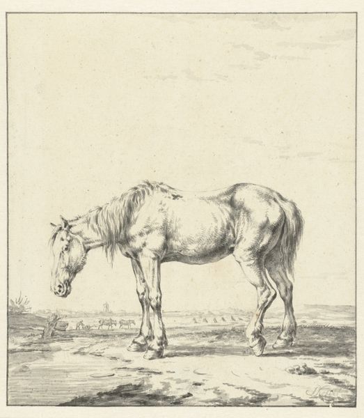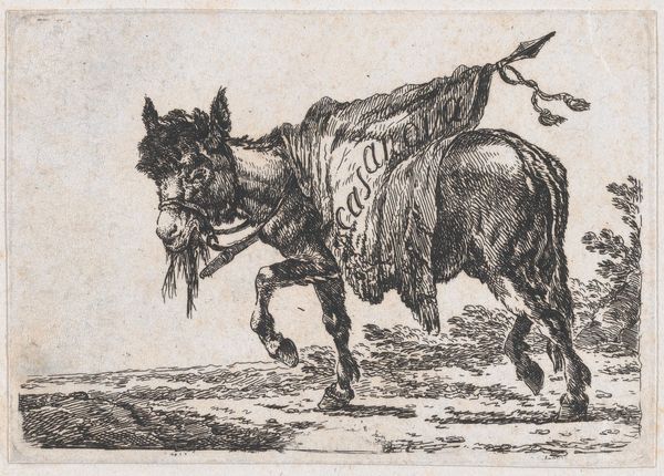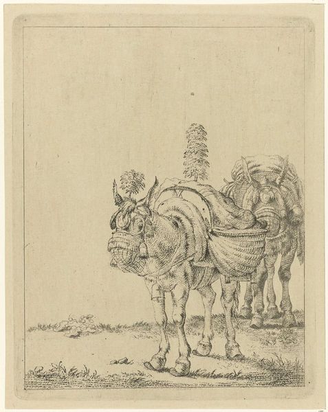 Pieter Cornelisz. Verbeeck created this etching of a saddled horse tethered to a post. Notice how the composition directs our gaze to the rear of the horse, its substantial form dominating the frame. The artist uses a network of fine, deliberate lines to describe the texture and musculature of the animal, contrasted against a subtly rendered landscape. The etching's monochrome palette further emphasizes the stark, linear quality. Verbeeck masterfully employs line and form to evoke the tactile presence of the horse. Consider how the artist destabilizes traditional portraiture by focusing on the animal’s posterior, challenging viewers' expectations and prompting a re-evaluation of subject and perspective. This challenges fixed notions of the relationship between the artwork and its audience. Ultimately, this etching uses its formal qualities to disrupt established meanings, inviting ongoing re-interpretation of both the artwork and the cultural values it reflects.