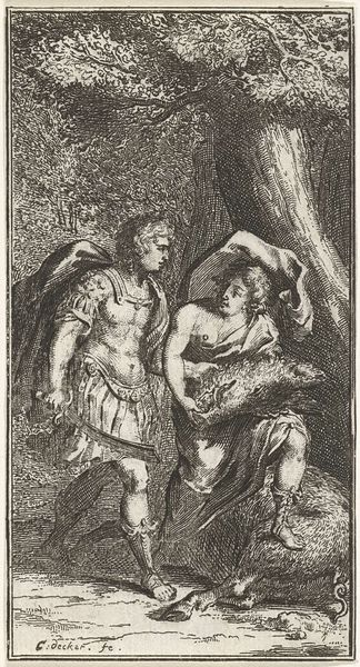Paul van Somer II created this engraving, Hieronymus, during the latter half of the 17th century, a period marked by significant religious and intellectual shifts in Europe. Here, St. Jerome is depicted not in the grandeur of a church, but in quiet contemplation amidst nature. Note how he’s presented with a blend of vulnerability and strength: his aging body is exposed, yet he sits upright, deeply engrossed in his scholarly work. The landscape and the saint's concentration evoke a sense of withdrawal from worldly concerns, emphasizing instead a focus on spiritual and intellectual pursuits. Van Somer presents St. Jerome as a man devoted to translation and scripture—a task that would have been seen as radical at the time. Consider how this image may reflect the changing attitudes toward religion and the growing importance of individual interpretation during the Reformation and post-Reformation eras. It invites us to consider the intersection of faith, intellect, and the personal journey towards understanding.