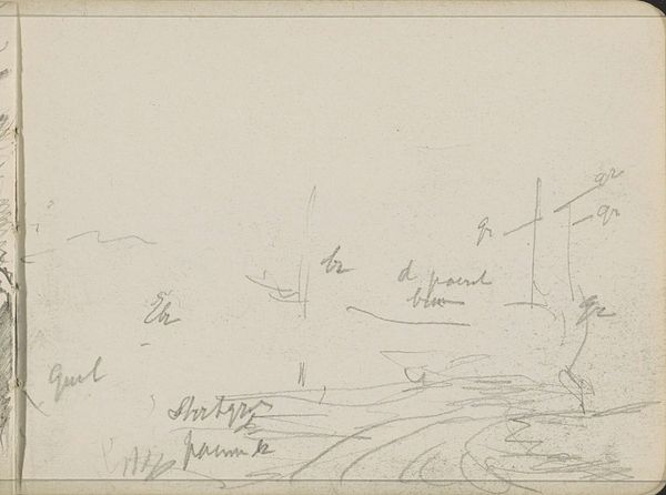 Curator: Today we're looking at "Polderlandschap met molens," a drawing by George Clausen from 1874. It’s a pencil and ink work, seemingly created *en plein air*, right there in the landscape. Editor: My first impression is how ethereal this sketch feels, almost dreamlike. The windmills and landscape emerge faintly from the page. Curator: Indeed. As a materialist, what strikes me most is that this drawing clearly comes from a personal sketchbook. It gives us direct access to the artist’s working process. The immediacy of the line work, combined with handwritten color notations, really collapses the distance between viewer and creator. It shows how sketches can function as experiments, as annotations, or as records of the artist’s observation. It almost anticipates future landscape paintings, or perhaps illustrates a poem, or even functions as a study for something. Editor: For me, it's the recurring windmill motif that holds my attention. They punctuate the horizon line like symbols, suggesting a deep connection to the landscape. Windmills often symbolize industry, yes, but here, rendered so faintly, they become something more ambiguous. They’re almost totemic, embodying the spirit of the place and maybe even hinting at human impact on the environment. Curator: I see what you mean. The way the windmills become embedded in this landscape hints at the economic forces shaping and changing land. The work almost reads like a reflection on rural life—and, if one chooses to be critical of it, perhaps even the start of industrialization's integration in nature and landscape. I find it interesting how an idea such as that can be delivered through such faint execution. Editor: And there is also something powerful, as windmills across cultures represent change, both destructive and constructive. Clausen's windmills might be emblems of progress, but they simultaneously conjure a feeling of loss and of the ephemerality of beauty. Curator: Absolutely. This work underscores that sketches, often dismissed as preparatory, can be sites of great innovation, and show an intimacy to land, material, and practice often removed by the finished product. Editor: A truly compelling piece of landscape work to interpret and a fascinating convergence of symbols of industry and the natural world to investigate further.