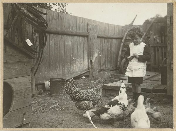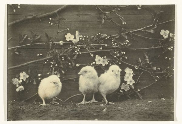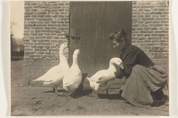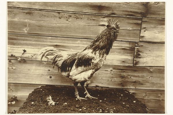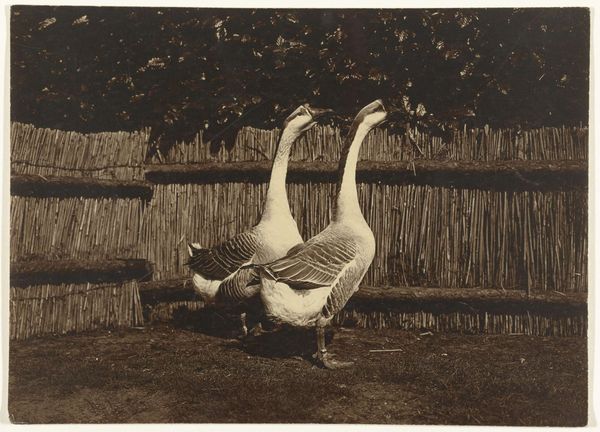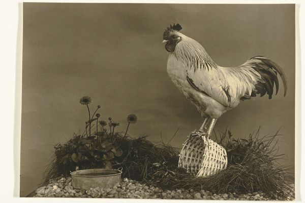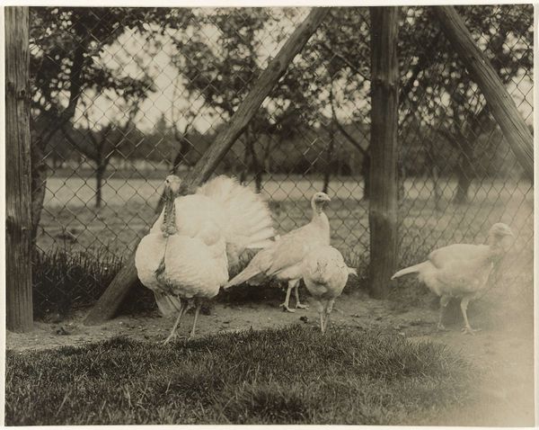 Curator: This captivating study comes to us from Richard Tepe. He made this print, entitled "Dierstudie van een pauw", sometime between 1900 and 1930. It’s now held in the Rijksmuseum. Editor: It’s ethereal. The monochrome palette makes this bird seem almost ghostly, a pure white vision against that dark, somewhat confining background. Curator: Confinement is a key aspect. The animal seems to be photographed within some kind of enclosure; notice the wire mesh in the background. This period saw an increasing interest in animal photography, often connected to zoos or private collections, serving both scientific documentation and public spectacle. Editor: Symbolically, the peacock, especially an all-white one, has diverse and ancient meanings. It can represent purity, vanity, and even immortality across different cultures and belief systems. Its display is about showing value; a cultural object with an emphasis on its visibility, literally displaying cultural value. Curator: Right, and consider the medium itself. Photography at the turn of the century was still somewhat novel, adding another layer of interpretation. The artistic approach to photography was still developing. Was Tepe simply documenting, or trying to capture something more symbolic about the bird's beauty or perceived status? Editor: I’m most captivated by its placement in front of that walled enclosure. A reminder that while beautiful, it exists separate and apart, maybe unable to roam free as other birds might, its display then forced and inherently artificial. Curator: Precisely. So the photograph reveals, not only the aesthetic appreciation of an exotic animal, but it poses quiet questions about captivity, display, and the human gaze. Editor: An elegant testament to the complexities beneath the surface, even within a seemingly simple still life. Curator: Absolutely. It invites us to look deeper at our own role in observing, and ultimately defining, nature's marvels.