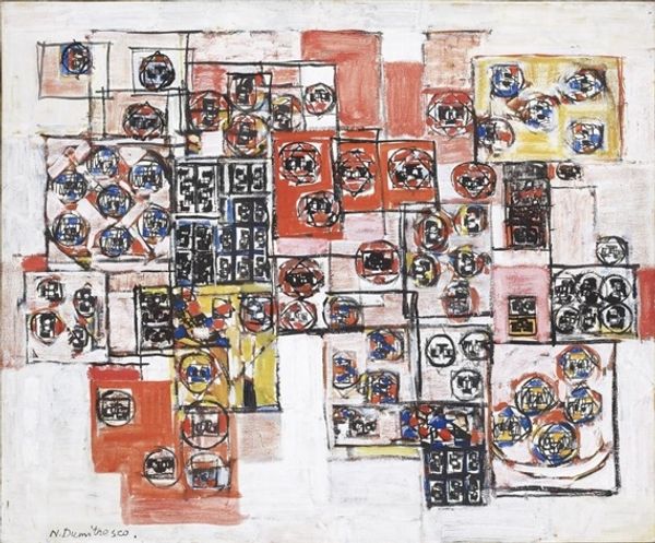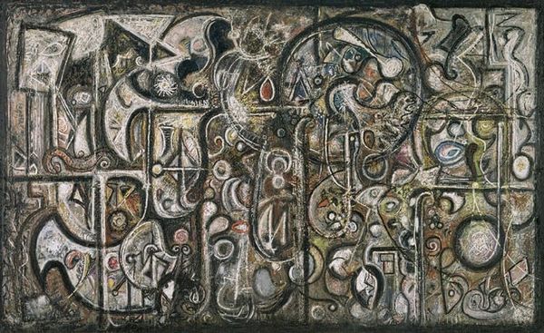 Curator: Let's turn our attention now to Richard Pousette-Dart's "Fugue Number 2," crafted in 1943. It is a piece where matter painting and acrylic interplay to present a complex arrangement of form and line. What strikes you initially about it? Editor: Well, immediately, it feels like peering into some sort of cosmic engine, all swirling parts and hidden mechanisms, if engines dreamt. The textured surface just buzzes with energy, almost restless, as if something's perpetually in motion just beneath the visible chaos. Curator: Indeed, the visual dynamics are pronounced. Observe how Pousette-Dart utilizes overlapping forms and contrasting tones to disrupt conventional figure-ground relationships, achieving a destabilized visual field. We see a semiotic exploration of symbols floating within a spatial ambiguity. Editor: Yeah, those little symbols do feel like clues left for… who knows what. To me, it is a jazz composition somehow got painted instead of played. Free-flowing and structured all at once. There are certain recurring shapes that do pull your focus around the whole thing, keeping it together as a single unit. Curator: Precisely. The circular motifs you noted, repeated and varied throughout, perform a structuring role despite the painting's overall non-representational quality. This repetition echoes musical form, aptly capturing the "fugue" referenced in the title. We can view it through a structuralist lens, perceiving a language of abstract signs. Editor: Ah, structuralist! My brain's going fuzzy just hearing that. I will take your word for it. For me, it evokes that period of early abstraction so obsessed with spirituality and symbolism. But maybe "spirituality" is really just an emotion trying to escape a form it hasn't quite invented yet. It just feels full of unrealized possibilities. Curator: A valid intuitive observation. We might then see Pousette-Dart's work as emblematic of the period's search for new expressive languages following the devastations of the early 20th century and with the rise of expressionism as a result of historical tensions. Editor: It makes you wonder where he was aiming to go with this stuff. You have to think every artist starts off with this pure burning flame. Something they have to wrestle out and onto the canvas, and then it shifts from one wrestling match to the next, that is the thing I most wonder about. Curator: His stylistic exploration does invite continued interpretation, particularly regarding how non-representational forms might yet articulate cultural anxieties of that era.
