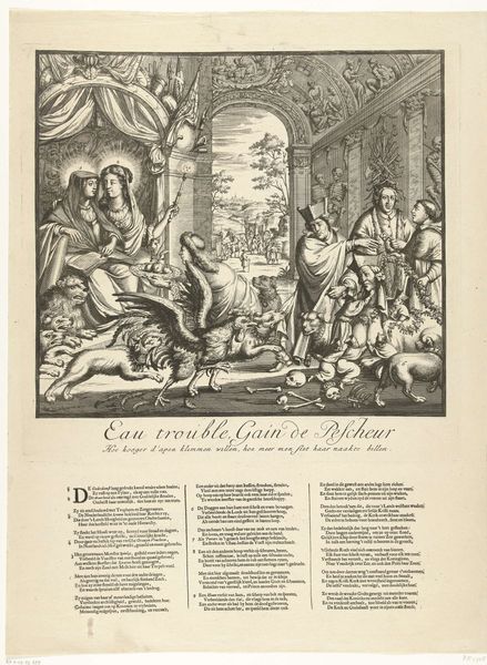 Editor: Here we have an engraving from 1637 titled "Moord op Sebastiaen de la Ruelle, burgemeester van Luik, 1637," artist is Anonymous. It looks like a series of panels depicting the murder of a mayor. It feels very graphic and...well, like propaganda. What's your take on this? Curator: It’s the intersection of craft, labour, and information dissemination that interests me. Engravings like these were a primary method of circulating news, and shaping public opinion. Notice the text alongside the imagery; how does the inscription reinforce a certain point of view on the social classes represented in this work? Editor: The text… it looks incredibly dense. And it surrounds the image like it’s boxing it in. So, the story isn't just in the panels, it's also dependent on the text? Was that a normal function for art at that time, or for printed engravings specifically? Curator: Exactly! Printmaking democratized art and information. Who controlled the means of production – the printing press, the engraver's tools, the access to distribution – held significant power. The materials and production were very important for its overall message. Consider the labor involved; this wasn’t painting for the elite, this was mass production. It became a tool. Editor: So it’s not necessarily about the artistry, or the individual skill of the artist… it’s more about how accessible these prints became. It makes me consider how the cost to print affected availability and affordability for a broader segment of society. Curator: Precisely. The materiality of the print, the relative cheapness of paper, and the mechanics of reproduction are all key factors. How does understanding this shift our perception of "high art"? Editor: This shifts everything for me. Thinking about it as a produced commodity designed for social impact completely reframes it from merely historical record to social activism! Thanks, I never would have seen this at first glance. Curator: These kinds of prints serve to illuminate how art is intertwined with production, access, and power structures. Looking at these panels allows one to trace the story not just of a murder, but also of evolving society.