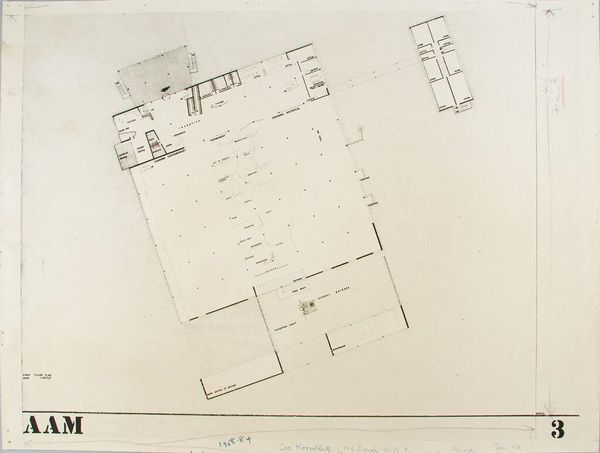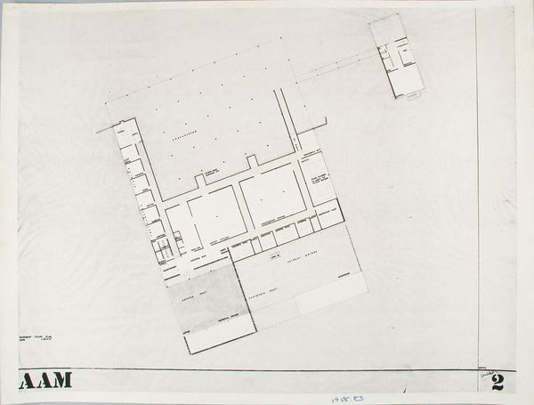 Curator: Here we have Leo Kornblath’s "Second floor plan," currently residing in the Harvard Art Museums. Editor: It feels clinical; the austerity of the lines and lack of texture is quite striking. Curator: Indeed. It's a working drawing, so the lack of adornment is key. Consider the labor involved in producing such a detailed document by hand, pre-CAD. It speaks to the architectural process. Editor: I'm more intrigued by the implied power structures inherent in architectural planning. Who gets to decide the flow of space and movement, and how does that affect those who inhabit it? Curator: A valid point. The design dictates material relationships and potentially social ones too. Editor: Precisely. Viewing it through the lens of social dynamics enriches the experience. Curator: Absolutely. It is a convergence of process and consequence. Editor: A blueprint for both a building and, perhaps, a system.