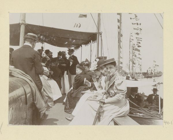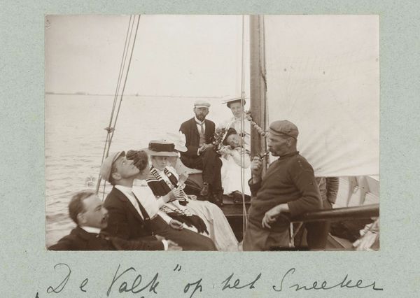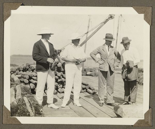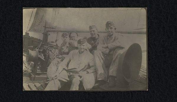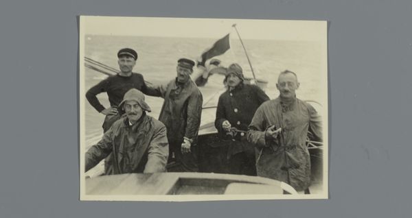 Curator: What a striking image. This is "Tussenlanding in Constantinopel," a photograph taken in 1924. The name of the photographer remains anonymous, so all we know for certain is it captures a slice of life from that moment. Editor: Immediately, I see celebration and daring. Everyone is smoking cigarettes and looking directly into the camera. There is so much hope in this historical moment; everyone believes in progress. And the person holding the bouquet seems to carry the biggest risk and seems relieved! I am curious to know the meaning behind the smoke? Curator: Considering it's called "Landing in Constantinople," I see a convergence of worlds. You've got the thrill of aviation symbolized by that individual, blending with the city and its culture. Smoke, for much of human history, has been an offering, an elevating ritual; maybe these figures lighting their cigarettes after that first flight is to be taken as a symbolic blessing for both man and machine. Editor: So it marks not only the thrill but a monumental union? The people puffing are like a band of mythical characters; the smoke reminds me of a call for progress during that period between the end of Ottoman empire and the Republic. The photographer has been able to condense so much historical symbolism with these faces in front of the plane. Curator: Indeed. Photography had this magical aura back then: a way of stopping time, and a kind of mystical power to materialize memories and to immortalize figures. Here, it captures something of the awe and the almost sci-fi wonder people had about this modern technology that transformed human experience. This plane, these figures are meant to be documented for an entire culture in need of new heroes. Editor: As technology marches on, these archival images teach us how technology intertwines with us; after all, the smoking hero will become old memories for our futuristic children, while their children will keep thinking about the smoke. Now I'm off to enjoy some fresh air myself and to enjoy life in new heroic times. Curator: And maybe spark new visions, grounded or airborne! It shows how a simple slice of captured light may come back to enchant generations through its layered memory.
