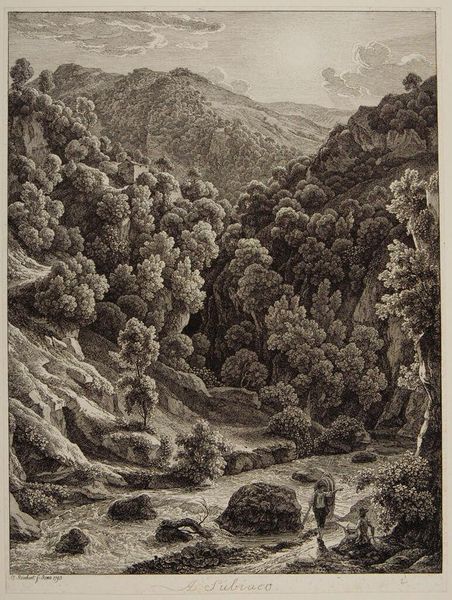 Curator: I find the subtle gradations in this print, Vicino a Subiaco by Jacob Wilhelm Mechau, simply breathtaking. Editor: Immediately, I’m struck by its quietude; there is a strong sense of solitude in this image of nature. Curator: Mechau, who lived from 1745 to 1808, really captures the sublime in the everyday. Note how the figures are dwarfed by the landscape. They almost disappear. Editor: True, and the way the light filters through the trees almost has a religious quality, don't you think? It's reminiscent of the romanticism found during the period. Curator: I'd argue that it underscores the power of nature against the fleeting existence of humanity. The composition and setting contribute to this sense of awe and insignificance. Editor: It is a compelling reminder of our place, or lack thereof, within the grand scheme of nature's domain. Curator: Yes, this is a conversation about perspective. Editor: Definitely food for thought.