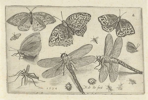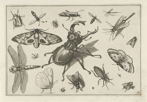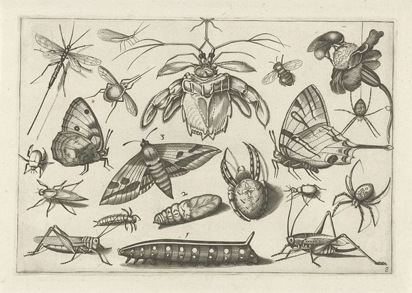 Jacob Hoefnagel created this engraving called "Insecten" at an unknown date, and it depicts a variety of insects and arachnids arranged in a grid-like composition. The image's meaning lies in the historical context of scientific illustration and the burgeoning interest in natural history during the late 16th and early 17th centuries, when it was made. This was a time of intense exploration and discovery, and detailed visual records of the natural world were highly valued by scientists and collectors, many of whom amassed large cabinets of curiosities. Hoefnagel’s meticulous rendering reflects a culture deeply invested in observing, categorizing, and understanding the natural world. As historians, we might consult period scientific texts, collection inventories, and the artist's other works to fully appreciate this print, because the meaning of art is contingent on the social and institutional contexts in which it was made.