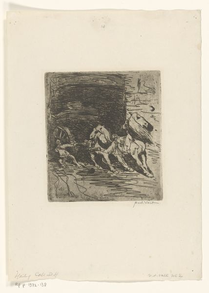 Henri-Charles Guérard made this print, ‘Revolt with men at a barricade’, using etching. It depicts a scene of violent uprising, likely situated in France. Guérard's choice of subject and style evoke the political turmoil of 19th-century France. This includes the Revolutions of 1830 and 1848, and the Franco-Prussian War. The print’s dark and chaotic composition reflects the instability of a nation struggling with questions of governance and social order. The barricade itself symbolizes the division and conflict within French society, as citizens took up arms against the established order. Artists of this time were often deeply engaged with the political issues of the day, using their work to express support for or opposition to the ruling powers. Institutions such as the press and independent galleries played a crucial role in disseminating these politically charged images to a wider audience. To truly understand this work, it is important to research the historical context in which it was created. Scrutinizing newspapers, political pamphlets, and records of artistic exhibitions from the time helps to shed light on the complex relationship between art, politics, and society.