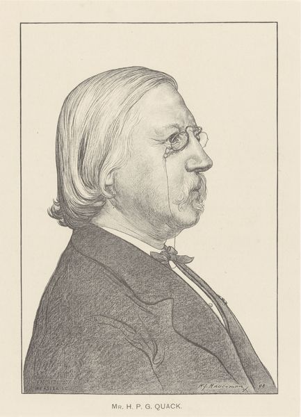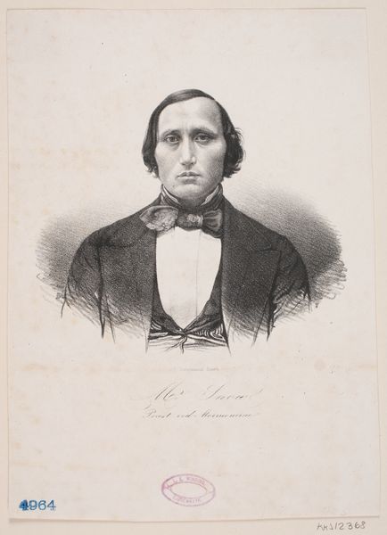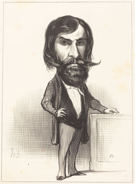 Curator: This is Honoré Daumier’s lithograph, "Auguste Avond," created in 1849. What’s your initial reaction to this portrait? Editor: The cross-hatching and exaggerated features create such a weighty and critical feeling. You immediately get the sense that Daumier is commenting on more than just Avond’s physical appearance. Curator: Exactly. As a lithograph, the image relies heavily on the skills of the printmaker. The labor involved in creating these lines is worth noting: each line etched into the stone contributes to that feeling you mentioned. It was then reproduced en masse for circulation in publications. Daumier aimed for wide distribution. Editor: Which speaks directly to the political climate of the time. Consider the rise of illustrated newspapers, and how Daumier used these platforms to critique the bourgeoisie after the 1848 Revolution. Avond is a "type," an embodiment of certain societal values, made accessible to the masses through this affordable medium. Curator: The choice of lithography allowed for a level of detail unattainable in wood engraving at that time. This adds to the complexity of the critique; look at the details in the clothing – particularly the checkered pattern on Avond’s trousers. Each line painstakingly rendered, highlighting status through visible signs of consumerism. Editor: Daumier weaponized portraiture. He’s not just presenting a likeness; he's building a social commentary. His images directly influence public perception, crafting opinions around people in power – using art to participate directly in the political discourse. Curator: This challenges our understanding of art’s role at that moment in France. Rather than being merely decorative, this lithograph acts as social mirror, reflecting—and distorting—the values of the rising middle class back at themselves. Editor: Looking at the physical details—the way Daumier employed readily available and affordable materials—shifts our focus towards thinking about how it reached such a wide audience. It’s truly democratic in a way traditional portraiture was never meant to be. Curator: Considering Daumier's commitment to challenging social norms and the structures that supported them through inexpensive, accessible images gives this piece particular significance. Editor: A poignant reminder of the intersection between material, medium, and socio-political expression.