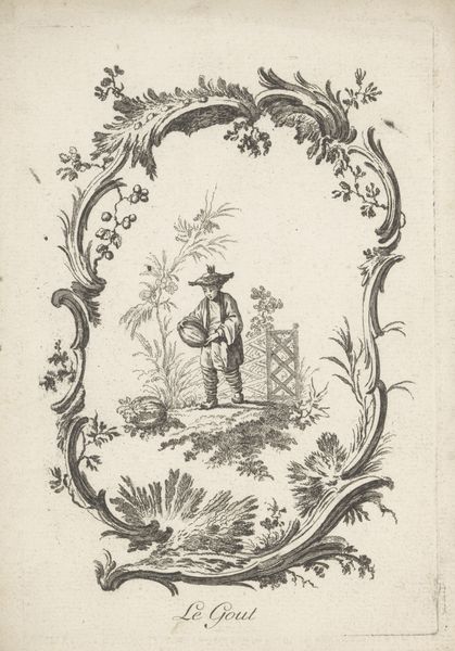 Curator: The first thing that strikes me is the overall delicacy, almost fragility, of this etching. Editor: It has a dreamlike quality, doesn't it? Let's delve into "Man met manden," possibly from 1759, an etching and engraving attributed to Pierre Charles Canot, currently held at the Rijksmuseum. Curator: Visually, my attention is drawn to the figure's hat—it feels symbolic in some way. And is that chair meant to look as though it's decaying, falling apart? Editor: The hat, along with his carrying pole and the baskets suspended from it, signal this man’s likely status. And indeed, that ruined chair signifies something of loss or disruption, juxtaposed against the detailed baroque ornamentation throughout the frame. Curator: Canot worked in England as well as his native France, so I wonder about the influences at play here. We see figuration within a landscape—genre painting infused with that delicate baroque touch. How do you interpret the choice of medium, this etching? Editor: I'm struck by how the etching embodies a certain moment of trade and the early era of globalization. We are literally given a glimpse of encounter as we see goods being transported within this garden of exotic looking vegetation and trees. It may reveal the cultural understanding between England and countries from the Far East at this time in the mid-1700s, especially due to the presence of the solitary figure. Curator: This image, created with what were, at the time, increasingly democratized printmaking methods, opens up a view of eighteenth-century understandings of class, labor, and exchange—the image is circulating along with those dynamics of power. And by depicting the chair seemingly falling apart within this ornamental garden landscape, Canot delivers a somewhat cutting commentary on power, as I see it. Editor: A potent symbol, rendered with incredible skill. Curator: Indeed, a testament to the layered readings a single image can hold, still provoking thought and discussion centuries later.