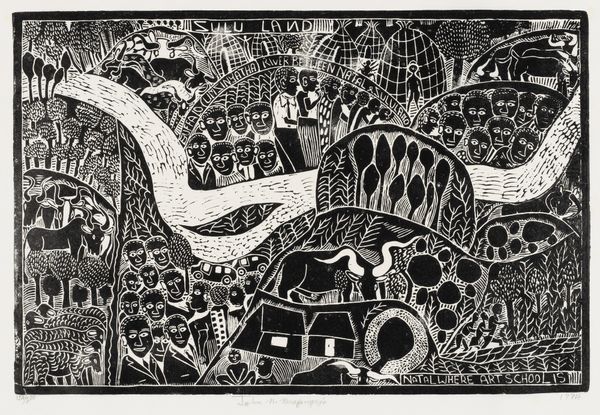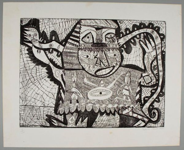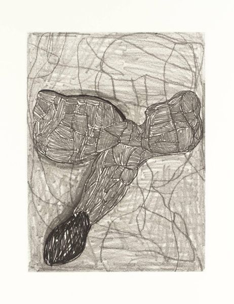 Editor: This untitled print by Bill Woodrow presents a flurry of black ink – abstract shapes, recognizable images like guns, and the word 'Circus'. It feels chaotic, almost like a visual scream. What social commentary do you think Woodrow is making here? Curator: This work speaks to the socio-political anxieties of its time. Consider the imagery: guns juxtaposed with the word "circus." Woodrow is commenting on the spectacle of violence in contemporary society, critiquing the way we are desensitized to conflict and power structures that perpetrate it. Editor: So, it's not just random imagery, it's a deliberate clash? Curator: Precisely. And look at the process of the printmaking itself. It's a medium often associated with mass production. Does that add to the commentary on the pervasiveness of violence? Editor: That's a good point! It highlights how easily we consume these images. I'll definitely think about that more. Curator: It's about understanding how art reflects and shapes our understanding of social realities.
