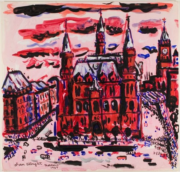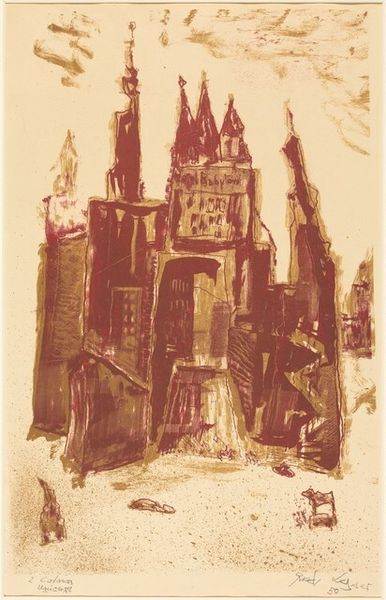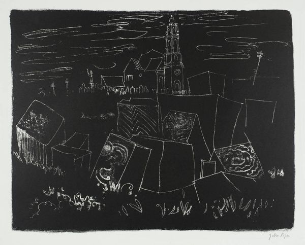 Editor: So, this is John Piper's print, "23. St James the Less, Westminster." It gives off this intense, almost gritty feeling, and it's hard to tell what materials were used. What's your perspective on how the materials contribute to the overall impact? Curator: The rough, textured quality suggests an exploration of printmaking's industrial roots. Consider how the process itself—likely a lithograph or screenprint— democratizes art production. Editor: Democratizes? How so? Curator: These methods enable wider distribution. Think about how this print contrasts with the traditional, singular art object, and its impact on accessibility and consumption. Editor: I see what you mean. It's less about the preciousness of the image, and more about its availability. Thanks! Curator: Precisely. Examining the means of production reveals its cultural value.