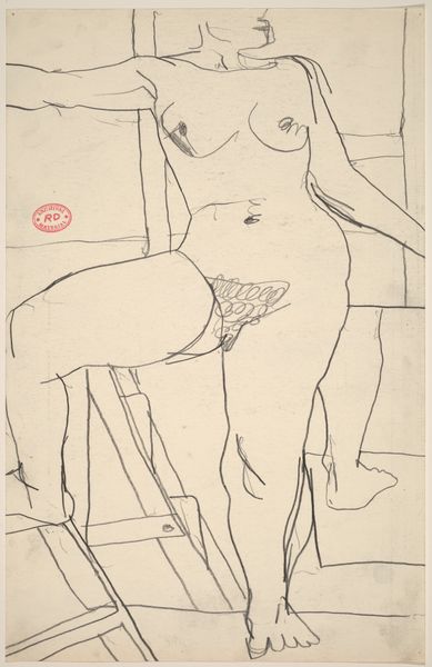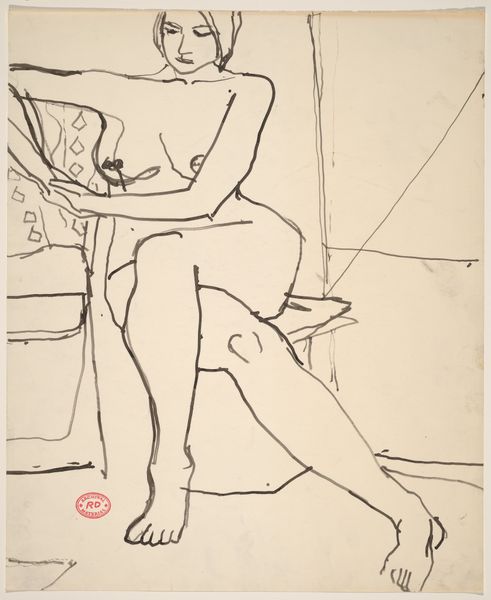 Curator: Here we have an ink drawing, created sometime between 1955 and 1967, titled "Untitled [seated nude with her left hand touching her face]" by Richard Diebenkorn. Editor: Wow, it feels incredibly immediate, almost like we’re looking at a fleeting impression captured in ink. The stark simplicity and those expressive, confident lines...there's something haunting about it. Curator: Indeed. The use of line is quite striking. Think about how a simple outline can still convey volume, emotion. Diebenkorn manages to suggest a whole inner world with the sparest of means. And what do you make of the pose itself, the woman’s hand obscuring part of her face? Editor: It’s intriguing, isn't it? Maybe a gesture of vulnerability, or perhaps self-reflection. The covering of the face evokes feelings of introspection. It feels deeply human. Almost melancholic, like she is wrestling with a question or a memory. The lines at the base strike me like the feeling one gets when they forget the punchline to a joke. They hint at something almost completed and the feeling is lingering like a phantom pain. Curator: The “Untitled” is quite apt, leaving space for us to insert our own interpretations. The crossed-out element on the lower right feels also charged. But there's also a timeless quality, an echo of classical depictions of the female form. A real sense of a continued study of the body. Editor: Absolutely! Even with this modern approach, it ties into an ancient visual dialogue. The sketchiness contributes to a unique charm, as if you interrupted a meditation. One I feel comfortable lingering in. Curator: It invites you in. This particular piece highlights Diebenkorn’s ability to synthesize tradition with a distinctly modern sensibility. The lines feel raw, direct. A window into the artist's mind in conversation with his subject. Editor: And perhaps our minds, too, as we observe. Art, always reflecting back. Thank you for illuminating the sketch.