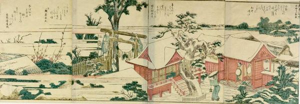 Editor: This is Utagawa Hiroshige's "TÅeizan Temple at Ueno," from his "Famous Places in Edo" series. The scene is blanketed in snow, with figures walking towards the temple. What cultural contexts are at play in this image? Curator: Consider the role of temples during the Edo period. They were not just religious spaces but also centers of community and sometimes even political power. How might the figures in this print be engaging with the temple in ways that extend beyond simple piety? Editor: I guess going to the temple could have been a social activity, a way to participate in the community? Curator: Exactly. The temple was a stage for interacting with social norms, power structures, and perhaps even resistance against them. This print captures a moment of interplay between the individual and the collective within that landscape. Editor: It’s fascinating to think about how a seemingly simple image reveals such a complex social landscape. Thanks for opening my eyes. Curator: My pleasure. Art offers a unique lens to examine social dynamics.