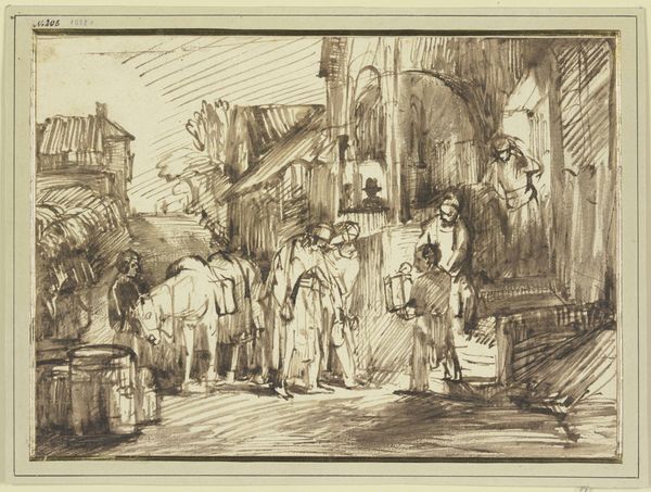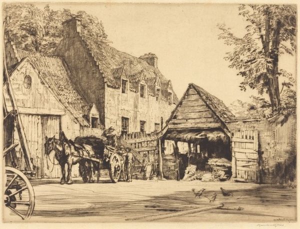 Editor: Here we have "The Blacksmith's Shop" by Spencer Gore. It’s undated and rendered in sepia tones. I find the scene so tranquil, almost frozen in time. What story do you think this image tells? Curator: This piece offers a window into the rural economy of its time. Note the positioning of the blacksmith shop itself; it’s not just a place of work, it is a hub that connects the community with the surrounding landscape. Editor: So, the shop's location is crucial to its function? Curator: Precisely! The composition highlights the workshop’s dual role, serving both local needs and broader economic networks, illustrating the social fabric woven around these essential trades. Editor: That makes me think about how vital local businesses were back then, influencing the entire community. Curator: Exactly. And reflecting on that, it reveals a different kind of value we might apply to our own contemporary lives.