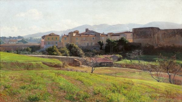 Editor: This is Elihu Vedder's "Roman Campagna," painted around 1868. It's striking how the warm tones give the landscape a hazy, almost dreamlike quality. The arch in the foreground really frames the scene. What do you see in this piece, particularly in relation to its historical context? Curator: I see a powerful dialogue between the idealized past and the realities of Vedder’s present. The Roman Campagna, even in the 19th century, was a landscape laden with historical baggage – the weight of the Roman Empire, of colonial ambitions, and of evolving social structures. Vedder isn’t just painting a pretty picture; he’s engaging with a space that has witnessed immense power dynamics. Do you notice how the soft focus seems to subtly erase any sign of contemporary life or labor? Editor: Yes, the absence of figures is noticeable. It's as if the land exists outside of time, or perhaps as a stage waiting for a new drama. Curator: Exactly! This absence speaks volumes. Consider the social and political upheavals of Italy during this period—the Risorgimento, the struggle for unification, the questions of land ownership and access. Vedder, an American artist painting in Italy, is implicated in these power structures. His romanticized vision, while beautiful, perhaps sidesteps a more critical engagement with the present. In what ways do you think his identity shaped this portrayal? Editor: It’s interesting to think about his position as an outsider looking in. Maybe the romanticism stems from a desire to connect with a historical narrative while remaining somewhat detached from the complexities of Italian society. Curator: Precisely. And this detachment allows him to present a view of Italy that aligns with certain romantic ideas that Western artists tend to perpetuate when discussing identity and landscape, reinforcing existing power dynamics within the cultural realm. Editor: I never thought about a landscape painting carrying so many loaded conversations within it. Curator: Landscape, like any art form, is never neutral; it is a reflection of cultural, historical, and personal perspectives. Examining these complexities reveals deeper meanings within seemingly simple scenes.