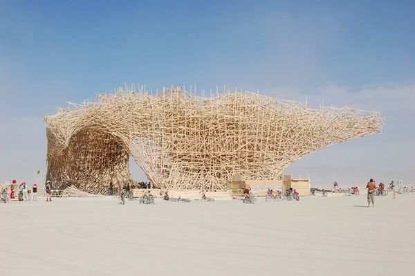 Editor: This is "The Passenger" by Arne Quinze, created in 2015. It seems to be made from many pieces of wood, creating this impressive, nest-like public sculpture. I’m curious, what stands out to you when you look at this work? Curator: I'm immediately drawn to the material itself. The raw wood, seemingly salvaged and repurposed, speaks volumes. How does Quinze elevate these mundane materials, typically used for construction, to the realm of art? Editor: It definitely blurs those boundaries. Is it the scale of it, or maybe the site-specific nature that challenges those ideas of "high art"? Curator: Exactly. Consider the labor involved, the sheer amount of work in assembling this massive structure. Also, public art always plays with social space. How does the location transform our experience? Editor: It makes you consider the people interacting with it. People pass through, under and around the structure – becoming part of its story. Is Quinze trying to point us to that intersection of art and life? Curator: Yes. It almost hints at the transient nature of modern life itself, temporary structures erected and dismantled. Editor: That makes a lot of sense! Thinking about materials and process really reframes how I understand the intention behind this sculpture. Curator: It shifts the focus away from pure aesthetics to how we, as a society, create and consume. I learned a lot too from rethinking materials within art.