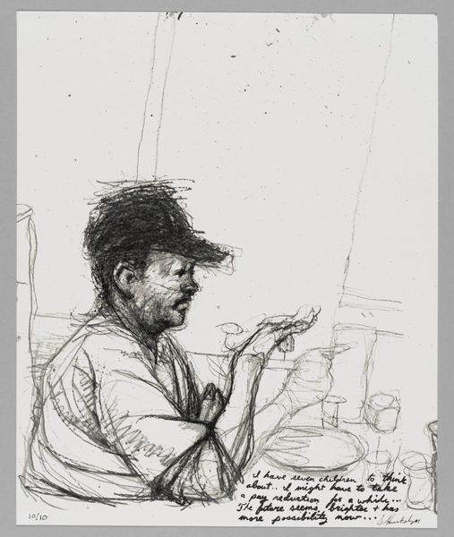 Curator: This is Sedrick Huckaby's "99% NO.65," currently held here at the Harvard Art Museums. It's a small print, rendered in grayscale. Editor: The starkness immediately strikes me. There's a somber mood, a weight in the subject's gaze. It feels intimate, yet distant. Curator: Huckaby's work often engages with ideas of community and representation, particularly of Black life. We might think about this piece in relation to broader social issues of visibility. Editor: Absolutely. The title, "99%," paired with the subject's downcast eyes, suggests a commentary on economic inequality and the struggles faced by marginalized communities. There's a silent protest here. Curator: Art historically, it sits within a tradition of social realism, but also speaks to the contemporary moment and its complex conversations around identity and representation. Editor: It's a powerful reminder that art can serve as both a mirror and a catalyst for change. Curator: Indeed, the work invites us to consider the narratives often absent from mainstream art discourse. Editor: It's a somber portrait, with the capacity to evoke empathy and incite critical thought about our society.