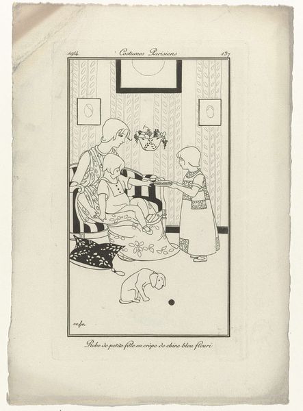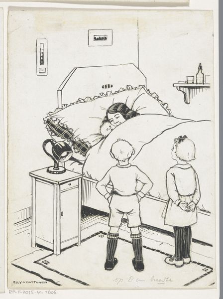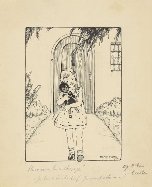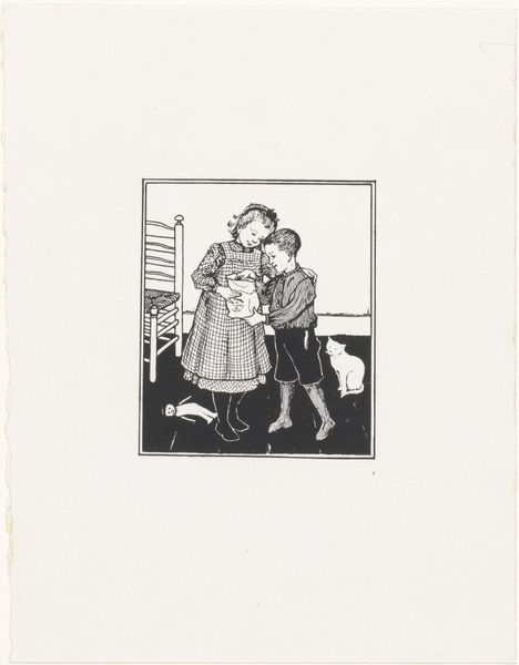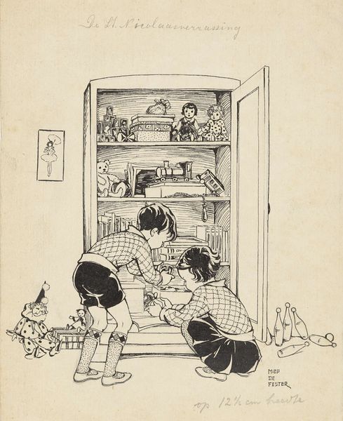 Curator: Here we have Miep de Feijter's "Twee kinderen bij een nest met kittens," or "Two Children with a Nest of Kittens," created sometime between 1928 and 1941. The medium appears to be ink and pencil on paper. Editor: It's instantly charming, isn't it? The composition is so simple, yet the balance is quite effective. I am captivated by the expressiveness achieved with such minimalist use of line. Curator: What strikes me is how this drawing potentially functions within the larger context of De Feijter’s production. Sketches like this were quite likely a crucial step in developing her illustration work. Were these works displayed independently, or primarily for studio usage? Editor: An interesting question, as it sits quite nicely as a vignette in and of itself. It seems self-contained, however. Do you think the visual weight distribution, specifically of the color blocking behind the young girl is an important structural consideration here? Curator: Yes, the touches of color serve an important formal purpose; yet this accent also has to do with social identity in her time. Coloring children in blue tones signifies their roles within the culture and gender expectations of that society. Also, considering wartime paper shortages might explain some material constraints impacting the color decisions of her creative choices. Editor: Perhaps, although I remain primarily interested in the interaction of form. The use of line to define form and space is exceptional, especially its implied presence through hatching. There is something also subtly unsettling about it that enhances the otherwise bucolic scene with a certain tension, as its lightness offers an interesting contrast. Curator: True, and it’s difficult to separate artistic choice from social influence when evaluating historical works like these, particularly as resources like paper and color become entwined with larger sociopolitical systems, so too must our analysis. Editor: Perhaps, however I find the intrinsic, balanced visual structures provide ample interpretive scope. Either way, this playful rendering is indeed captivating on closer inspection. Curator: It does provide many points of reflection indeed, viewing not just its formal artistry but as a microcosm reflecting its time of making.