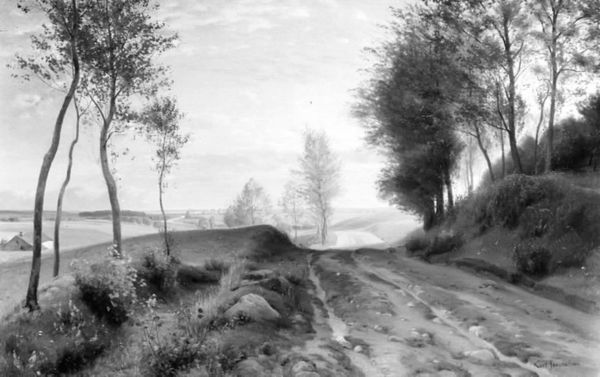 Curator: Looking at "Road near Village" from 1646, created by Guillaum Du Bois, immediately evokes a somber mood. The monochromatic palette certainly emphasizes a quiet melancholy. What do you notice first? Editor: Well, formally speaking, I’m drawn to the artist’s handling of light and shadow to create depth. The road, with its curves, is an astute tool for leading the eye, even in grayscale. Curator: It's worth considering this use of light within its historical moment. Paintings like these documented land use and asserted claims to the Dutch countryside. Consider this genre scene alongside concurrent expansion and reclamation projects. Editor: I see your point about the societal context, but the monochrome application appears deliberate. The interplay of tone emphasizes the compositional architecture, doesn’t it? The steeple in the background echoes forms of trees that surround the figures along the pathway. Curator: Indeed, and that path is no accident. This genre painting invites you to read Dutch society through its well-trodden roadways. Wood panels would have been common and relatively affordable, an accessible medium that expanded production beyond elite circles. How does this accessibility play into our understanding? Editor: Intriguing. So, in essence, we consider it not simply as aesthetic exploration but through who could access, afford, or even depict such scenes. I appreciate your insistence that we think beyond mere pictorial space and analyze the physical and economic dimensions behind its making. Curator: Exactly. The monochrome effect might speak to constraints in material access too. This opens up interpretation, moving us from a singular focus on artistic expression to analyzing conditions. Editor: Fair enough. Analyzing the production conditions adds complexity. I concede it broadens beyond a purely optical read. Curator: It shifts emphasis—illuminating class, labor and access to resources, thereby connecting stylistic choices to material realities. Editor: An insightful reframing; I hadn’t considered it that way before. Thanks for guiding us through that exploration!
