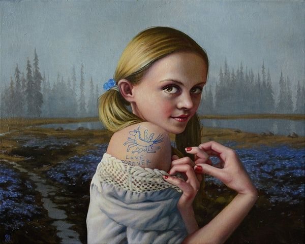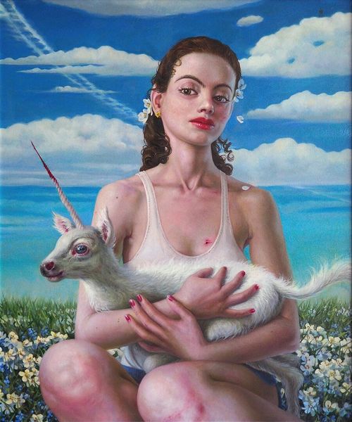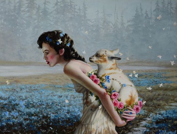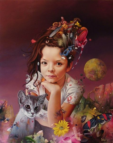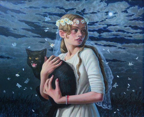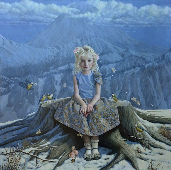 Editor: This oil painting, "Solicitude," was created in 2017 by Jana Brike. The image is immediately striking, it shows a girl in a flower crown gently holding a sloth, and they both have similar crowns. There's a stillness and quiet thoughtfulness to it. What kind of narratives do you think are woven into this painting? Curator: This image hums with layered symbolism. Notice how both the girl and the sloth are adorned with flowers. Flowers traditionally represent fleeting beauty and the cycle of life. But here, given the title "Solicitude," they also whisper of offering, of gentle protection. Editor: So, the flowers aren't just decorative, they speak to the caring nature of the figures? Curator: Precisely. The girl's gaze, directed slightly upwards and to the left, suggests a contemplation beyond the immediate present, almost as if she’s intuiting future events. How does the presence of the sloth resonate with you? Its traditionally symbolic role? Editor: Well, sloths aren't exactly known for speed, are they? Usually symbolizing laziness and such. Curator: Exactly, however, Brike may be inviting us to reconsider that association. The act of holding the animal embodies care and tenderness towards something that may need protection. Look closely—doesn’t the sloth's gentle expression reflect that sentiment back at the girl? Consider the path she stands upon, blanketed by flowers - is she embarking upon a transformative path? What stories could it tell? Editor: It could signify new beginnings or maybe a path filled with beauty and gentleness, given the floral motif. Curator: Indeed. Through careful consideration of symbols, the artwork creates a world where caring is not passive but represents action, reflection and, possibly, even revolution. Editor: It’s interesting how understanding the symbolism enriches the experience and makes the piece so much more thought-provoking. I am struck at how the meaning has changed for me now! Curator: Me too! It underscores art’s amazing ability to be understood through many perspectives.