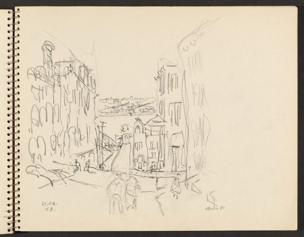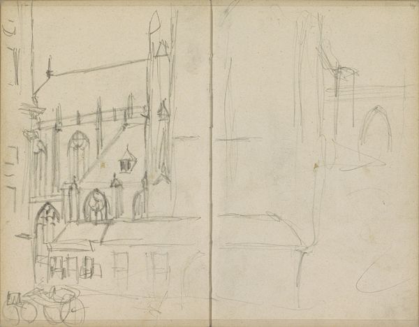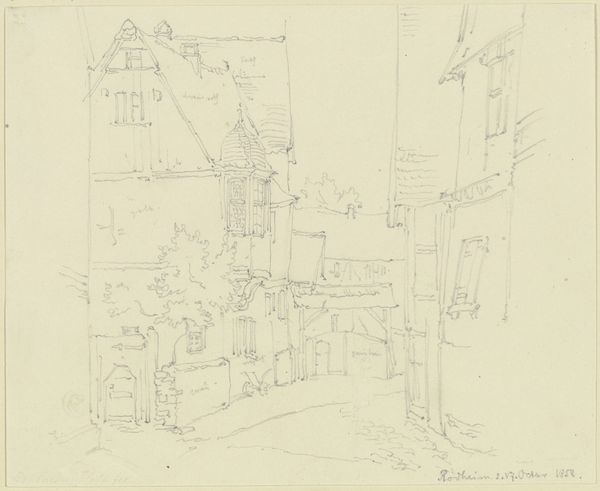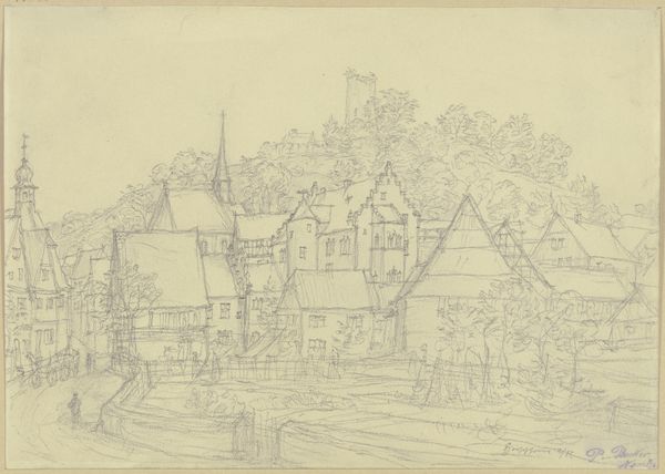 Editor: This is “Runkel on the Lahn,” a drawing by Peter Becker from the 19th century, done with pen on paper, here at the Städel Museum. It feels like looking into the artist’s personal sketchbook—a glimpse of a place through their eyes. What does this sketch evoke for you? Curator: This piece really speaks to the way the 19th-century artist engaged with the landscape as a cultural and historical artifact. Sketchbooks served as a visual diary, capturing not just the appearance of a place, but its essence. Think about the rise of tourism at this time and how artists played a role in shaping the perception of places like Runkel. What do you notice about how Becker chooses to represent the architecture here? Editor: I see the way the lines capture the structures, and how they feel superimposed upon the natural world. Was he aiming for documentation or something else entirely? Curator: That tension between nature and architecture is key. He wasn’t just documenting; he was participating in a larger artistic project of defining Germanness, specifically. The rugged landscape and imposing architecture, seen through an artistic lens, helped construct a national identity, a romantic view of the past. Where do you see this idealized past being conveyed in his artistic choices? Editor: Definitely in the architectural details—the emphasis on the buildings' solidity, hinting at permanence and history. It makes me think about who was able to access art and culture during this time, who was given permission to create it, and how this accessibility contributed to the historical narratives of the region and people it showcases. Curator: Precisely! The seemingly simple act of sketching becomes a statement about cultural values and historical narratives. It underlines art's public role in shaping our understanding of identity and place. Considering the sociopolitical currents present within German principalities during this time, we have to question whose image is broadcasted and for what purpose. Editor: I hadn’t thought about how a sketch could carry such weight! Curator: These images provided not only snapshots but building blocks in collective identity. Editor: That’s a powerful point to consider. Thanks for expanding my understanding!