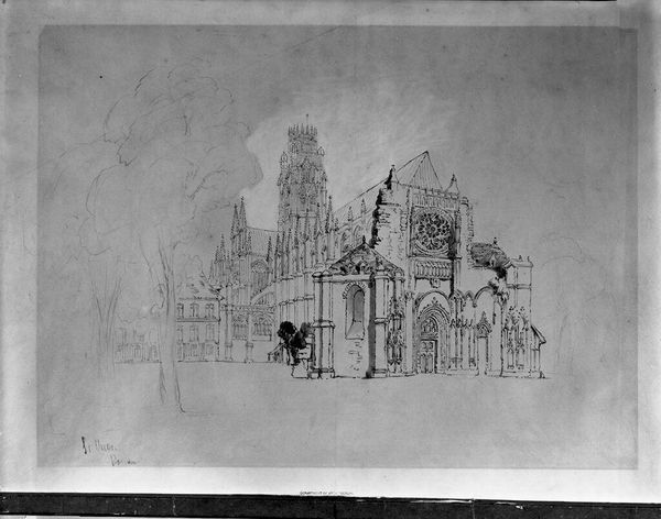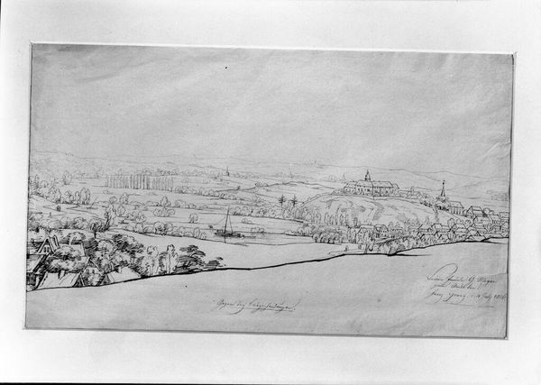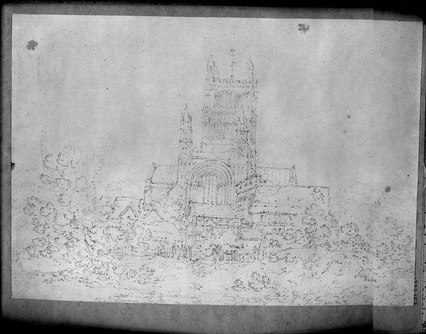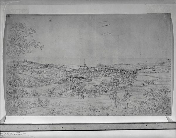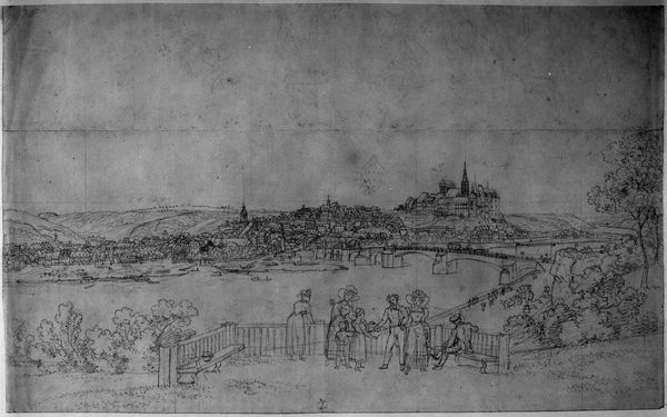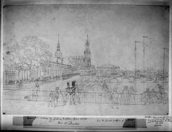 Curator: This drawing by Adrian Ludwig Richter captures "Dresden: A View of the Augustus Bridge Looking toward the Hofkirche". What’s your first impression? Editor: It feels so light and airy, almost ephemeral. The delicate lines give it a dreamlike quality. Curator: Richter, working in the 19th century, was deeply invested in representing German landscapes and cityscapes. This piece offers a glimpse into Dresden’s civic life. Editor: Look at all the figures crossing the bridge! I wonder about the social dynamics at play. Who has access to this space and who is excluded? Curator: Indeed, the bridge itself, as infrastructure, becomes a site where societal hierarchies play out. Editor: Considering Richter's political leanings, it makes me ponder the narrative he's constructing around the bridge and the church. Curator: It is fascinating to see how this seemingly simple sketch can provoke complex questions about access, power, and representation. Editor: Yes, art reveals the layers of history and identity embedded within seemingly ordinary scenes.