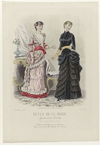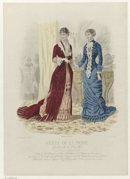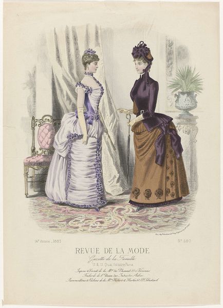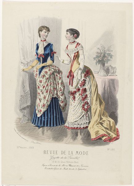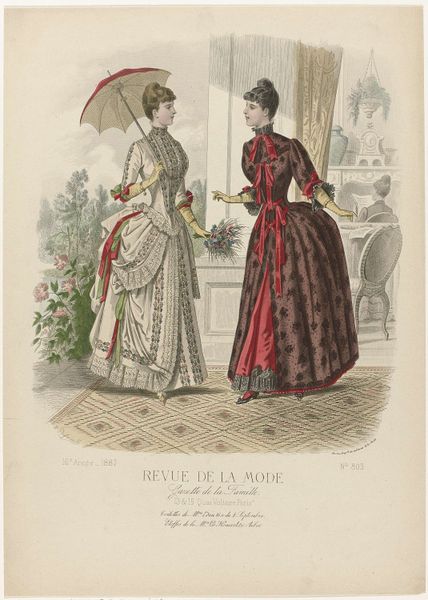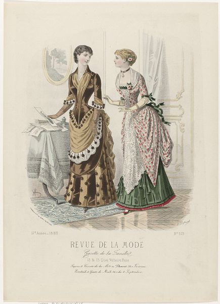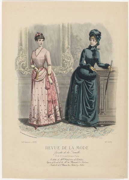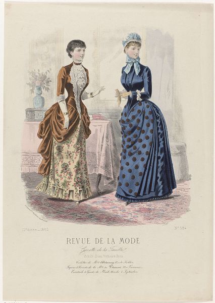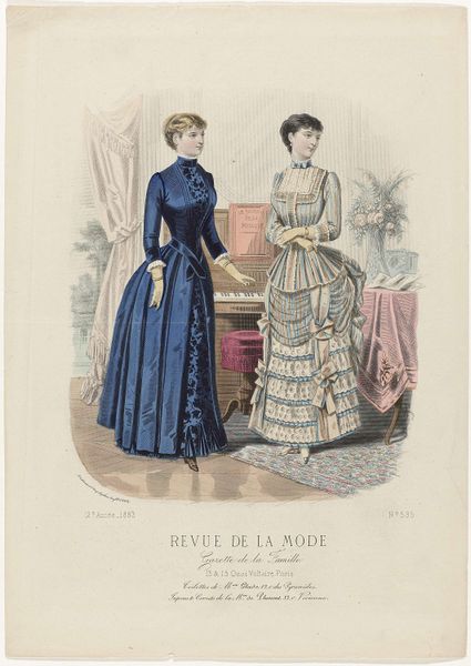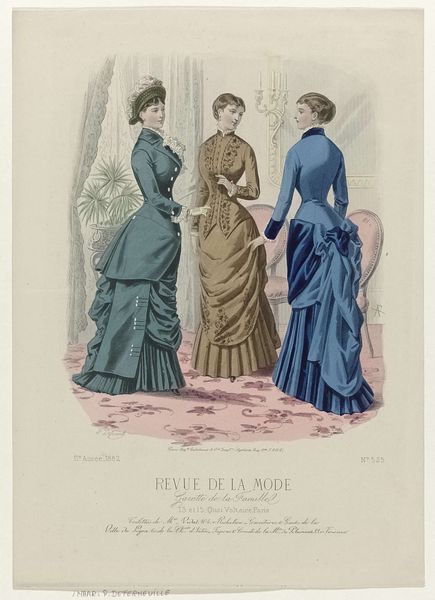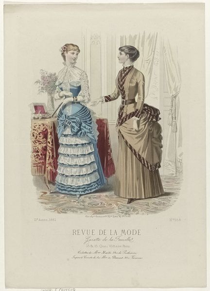 This fashion plate was printed in Paris in September 1882, as part of the Revue de la Mode, Gazette de la Famille. It represents the cutting-edge of womenswear at that time, though today, it also speaks volumes about the social conditions of its making. The printmaking process itself, likely a form of lithography, was by then highly industrialized. It allowed for the relatively quick reproduction of images like this one, feeding a growing consumer appetite for fashion news. But, of course, the dresses shown here also point to other kinds of labor. All that intricate seaming, gathering and trim would have been done by skilled dressmakers, most of them women working long hours. The final result is beautiful, but it’s important to remember the full picture: this image is a window into a whole world of making, consumption, and class relations. By considering the means of production, as well as the artistic outcome, we gain a deeper appreciation of this artifact.